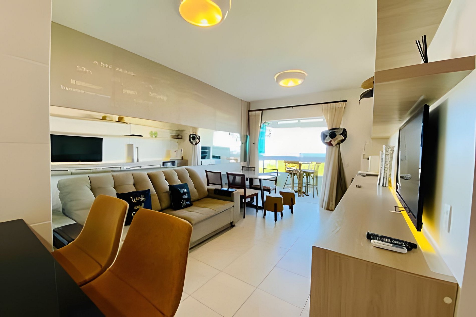 Varanda com churrasqueira, sala com um gigante e confortável sofá, ar-condicionado e Smart TV grande. E tudo isso podendo ver o mar o tempo todo.