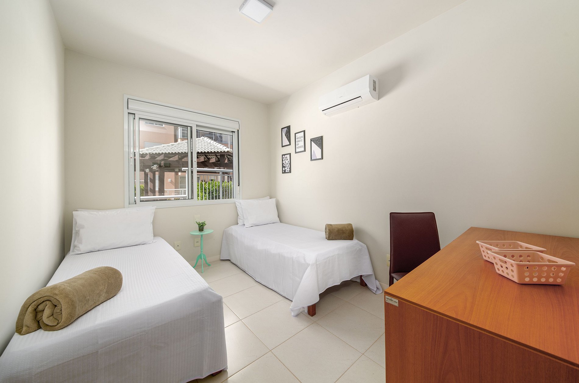 Apartamento Térreo com piscina privada instalada numa ampla varanda com churrasqueira e cercada. O apartamento oferece 2 quartos com ar-condicionado, sendo uma suíte e o segundo quarto com duas camas solteiro e dois colchões extras e espaço Home Office.