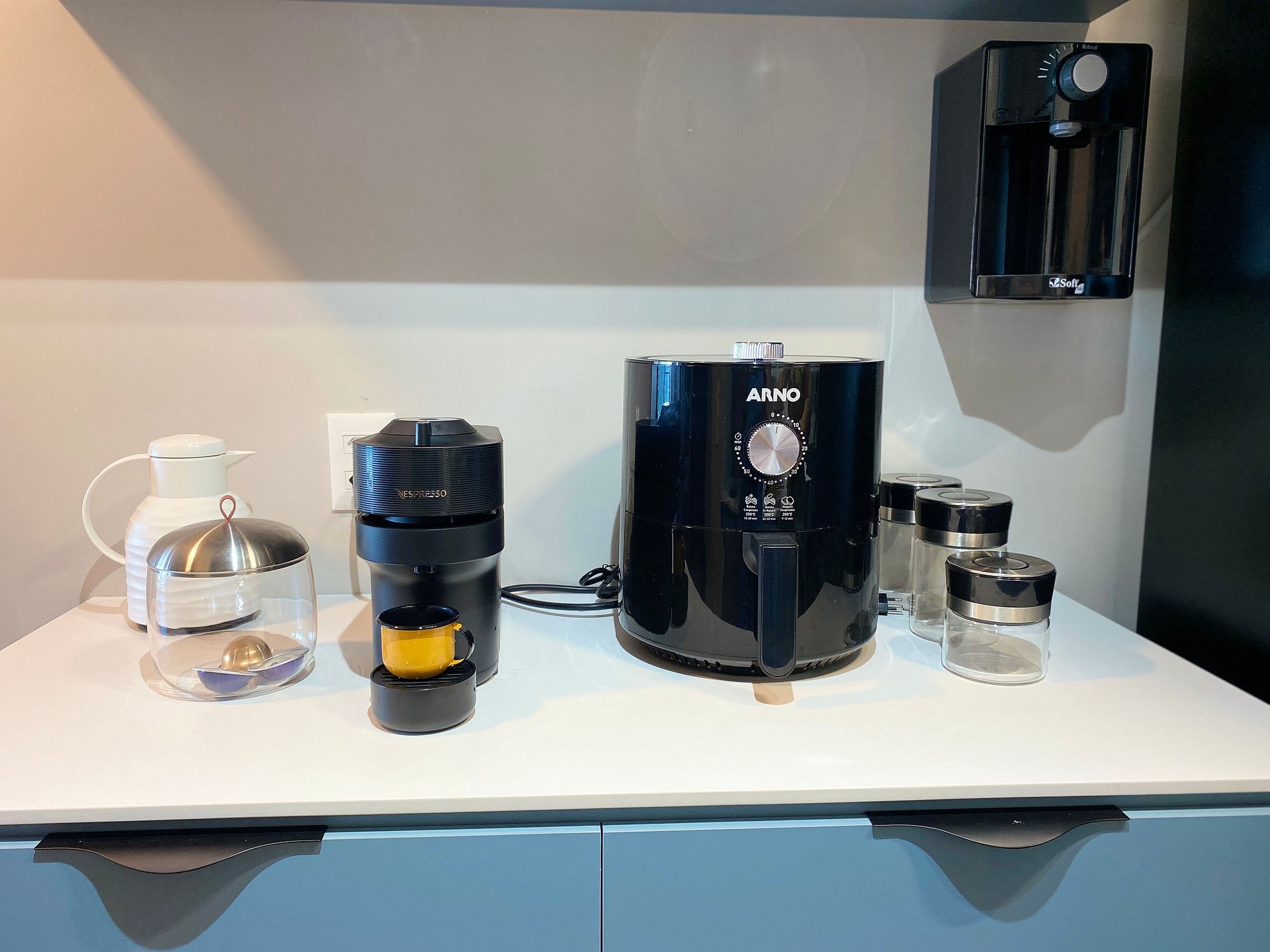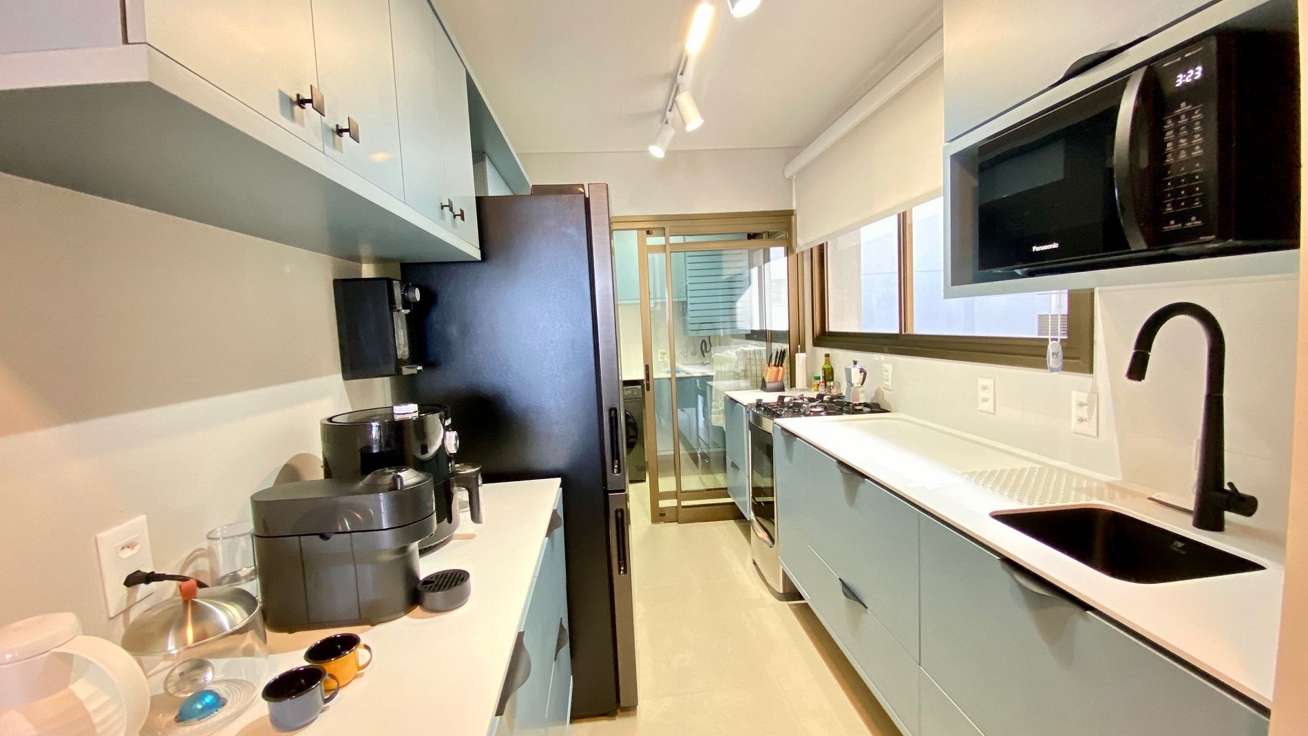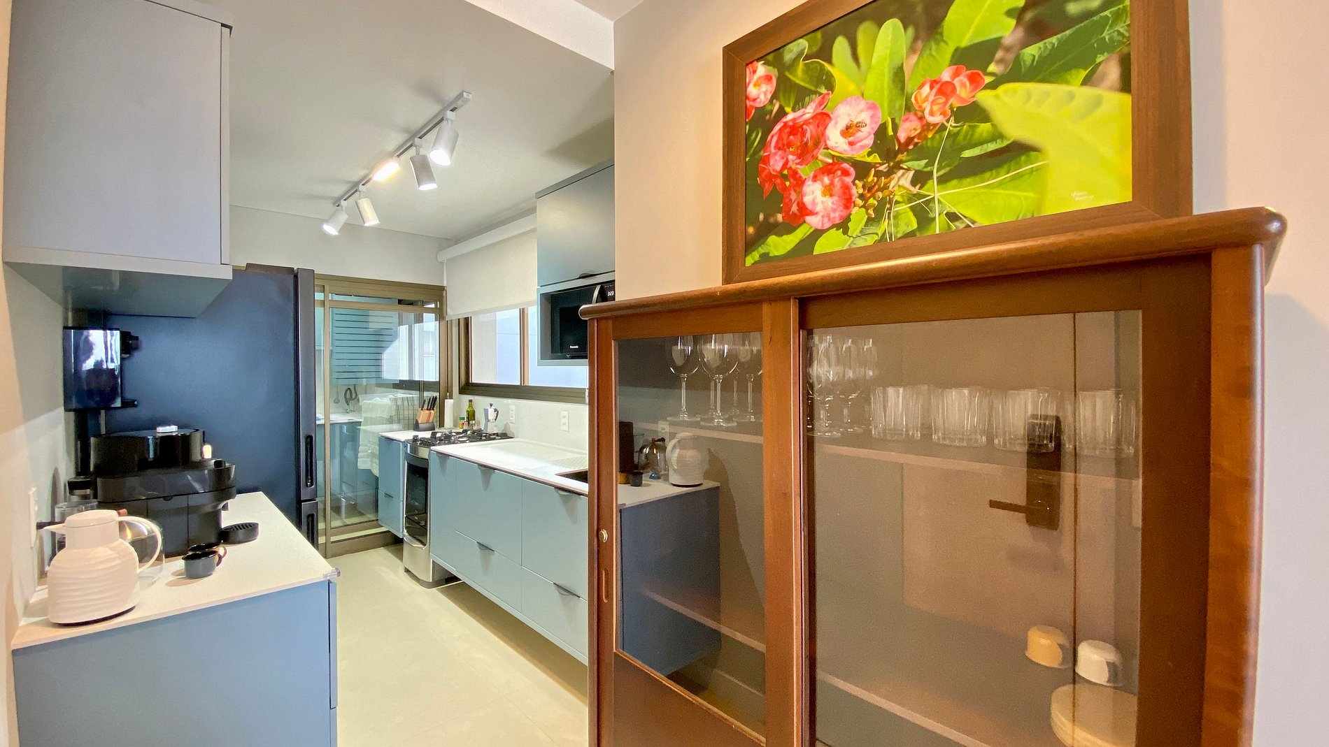 Cozinha completa, sala de jantar e sala de estar conjugados. Ambiente climatizado.