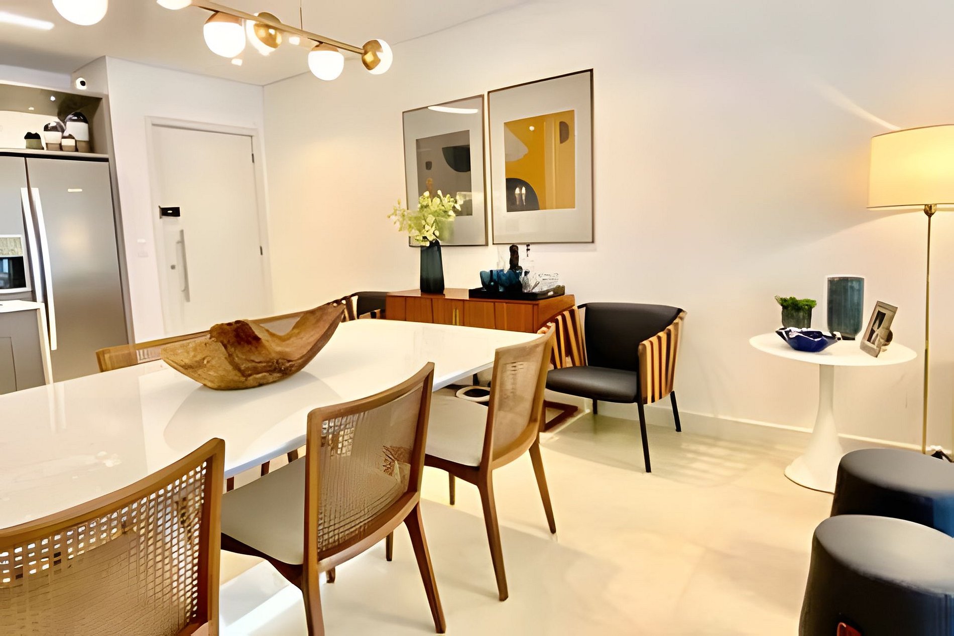Sala de jantar com 6 lugares, em ambiente integrado com Sala de Estar e cozinha. Todos os ambientes são climatizados e com itens de altíssima qualidade.