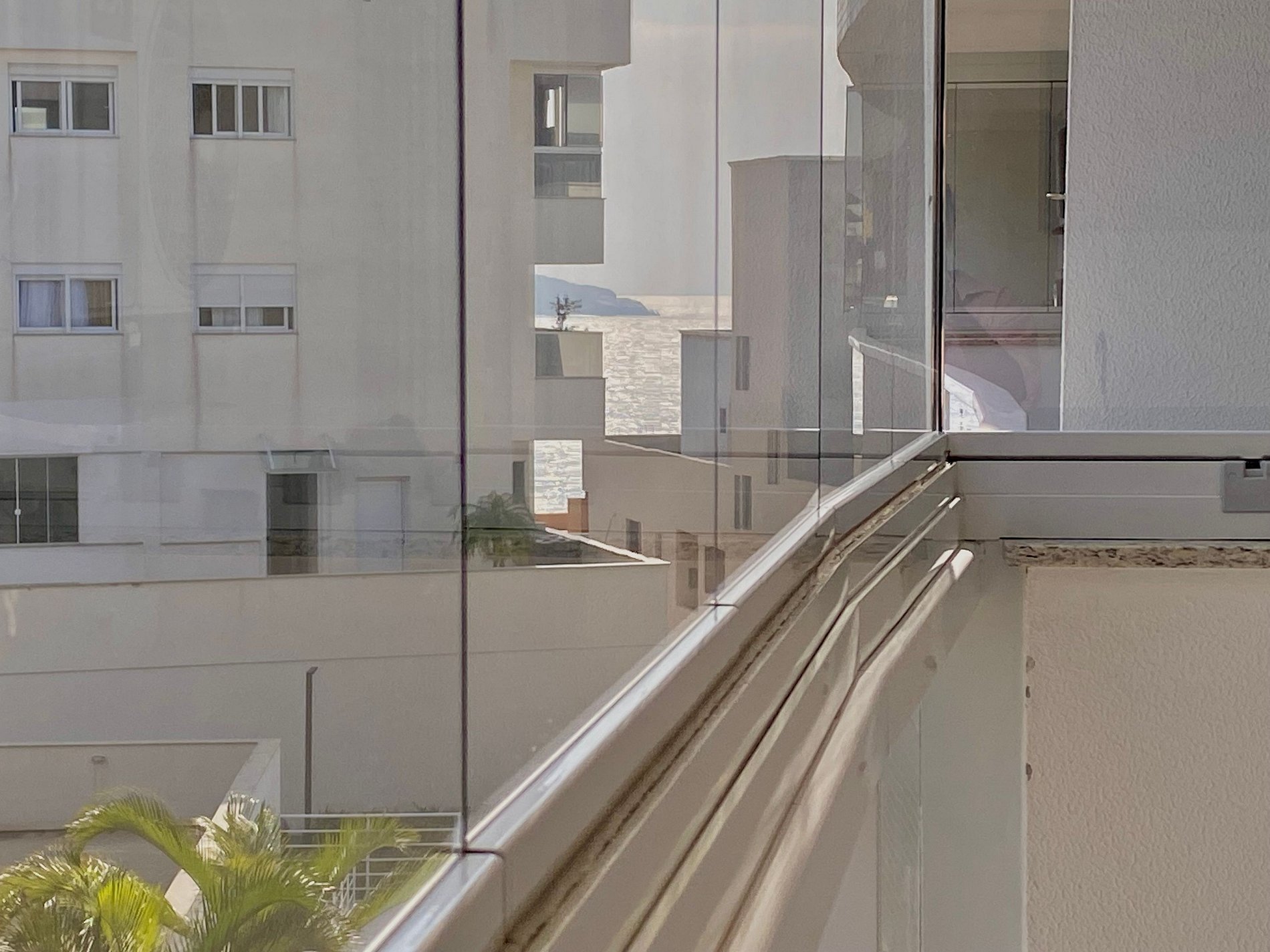 Lavanderia com lava e seca e varanda com churrasqueira, fechada com vidros que podem ser abertos.