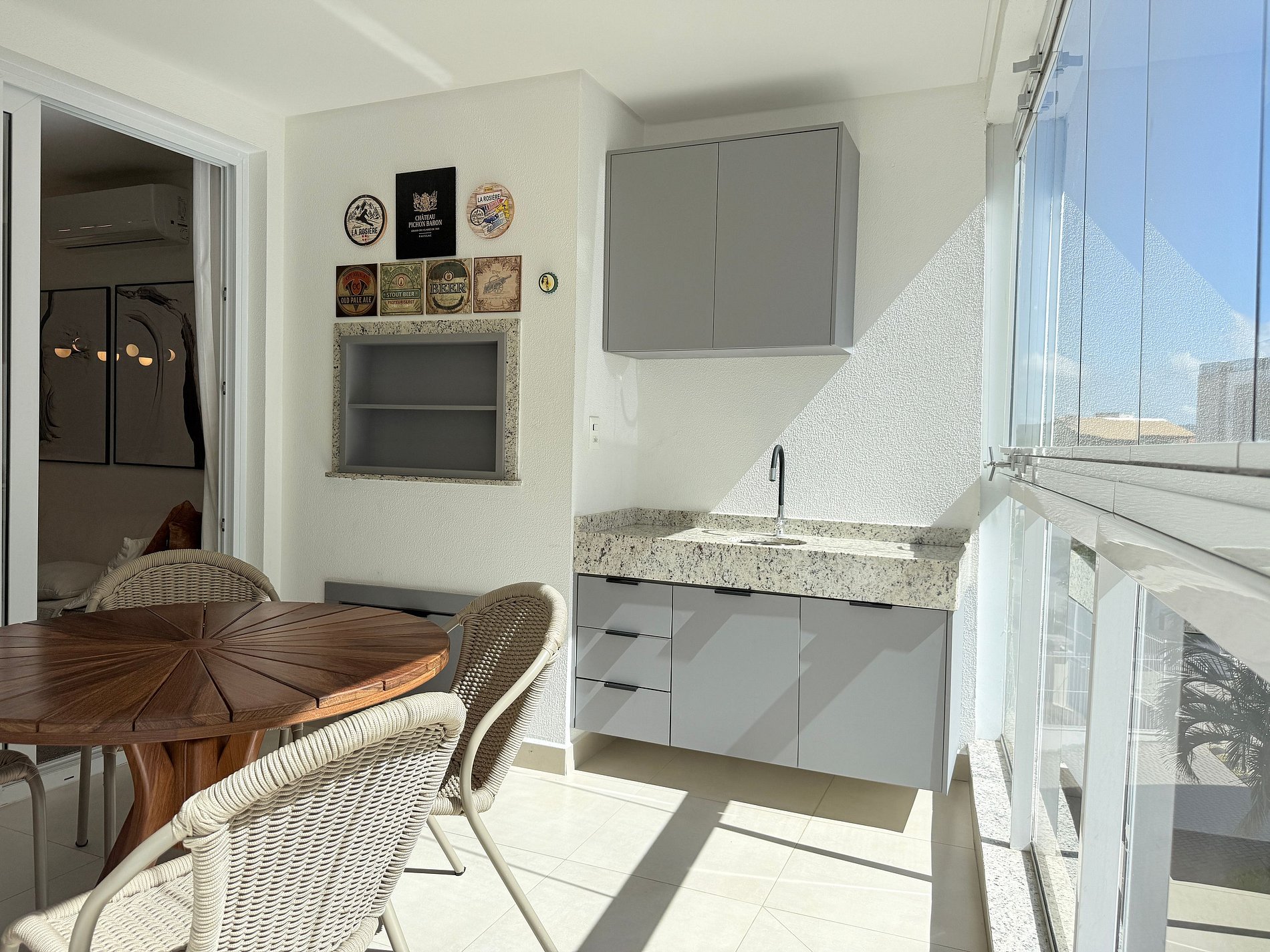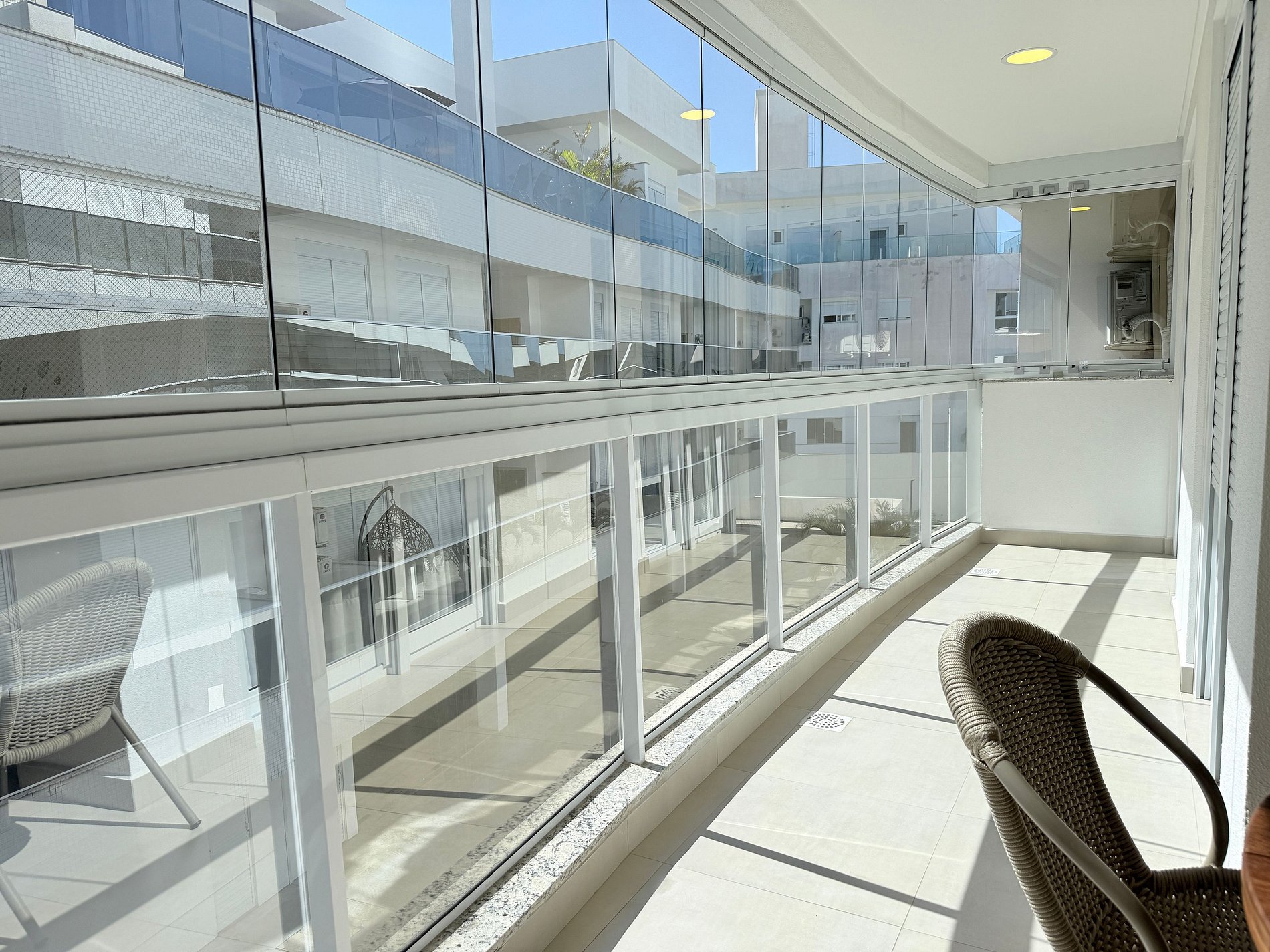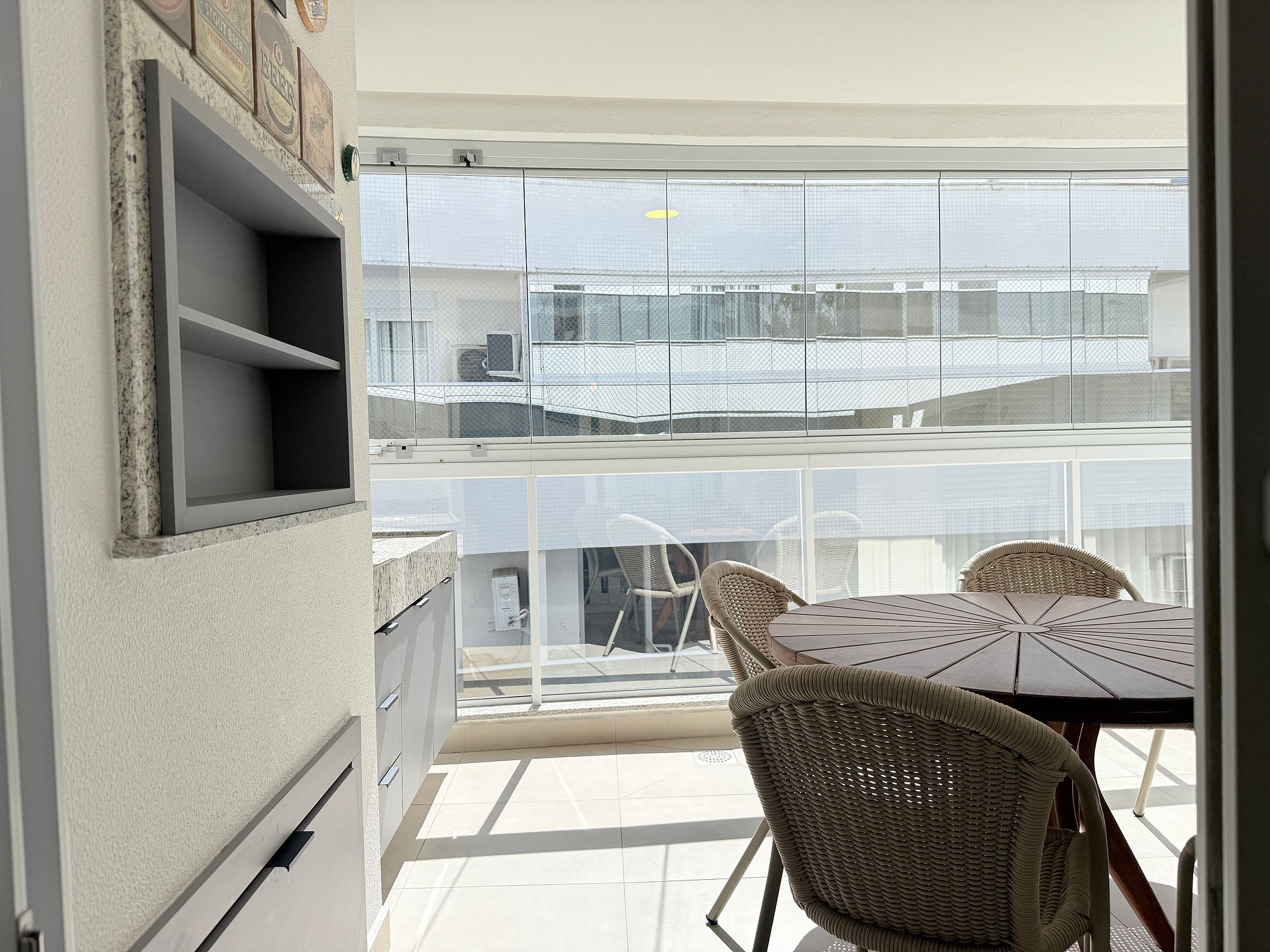 Lavanderia com lava e seca e varanda com churrasqueira, fechada com vidros que podem ser abertos.