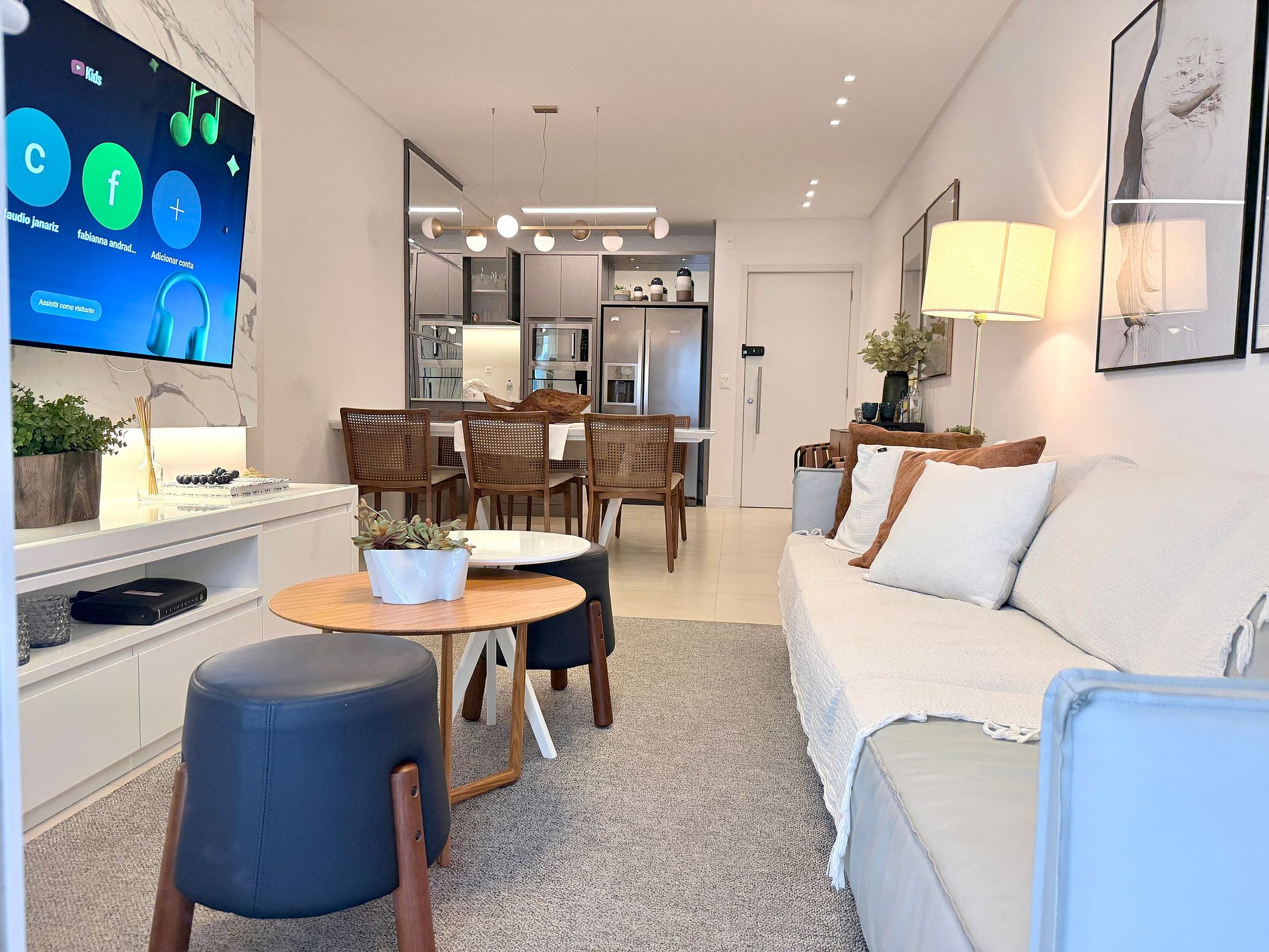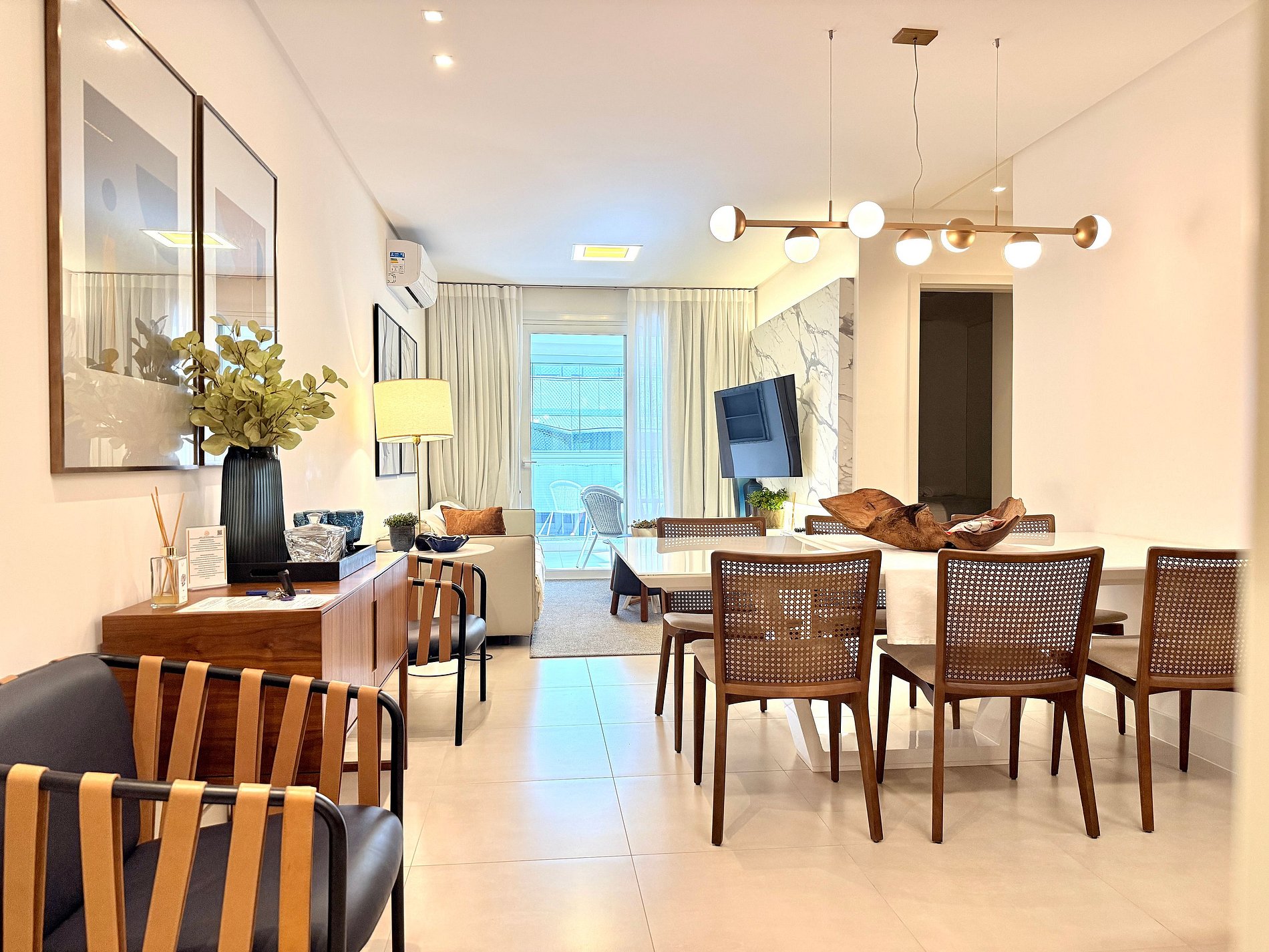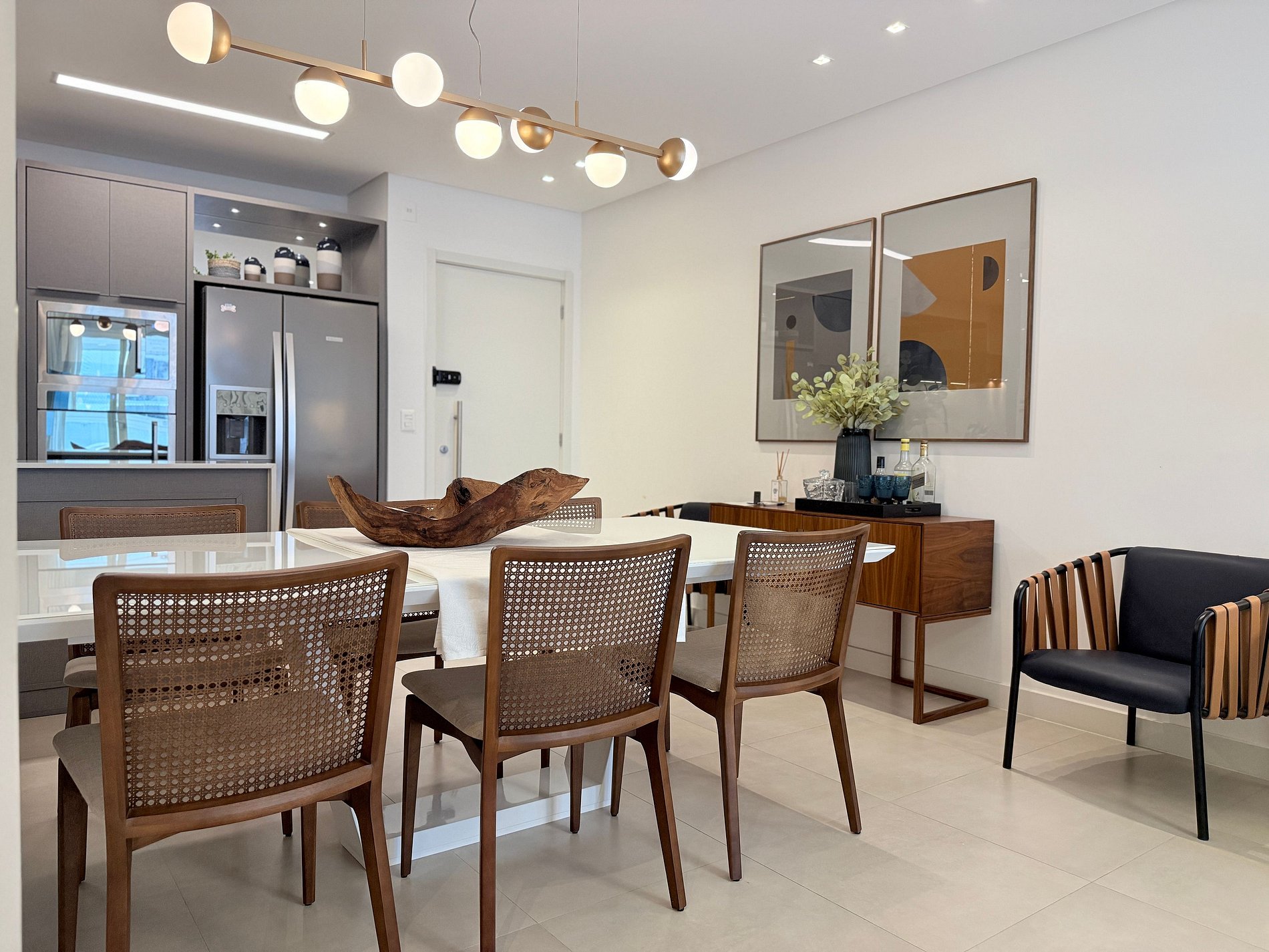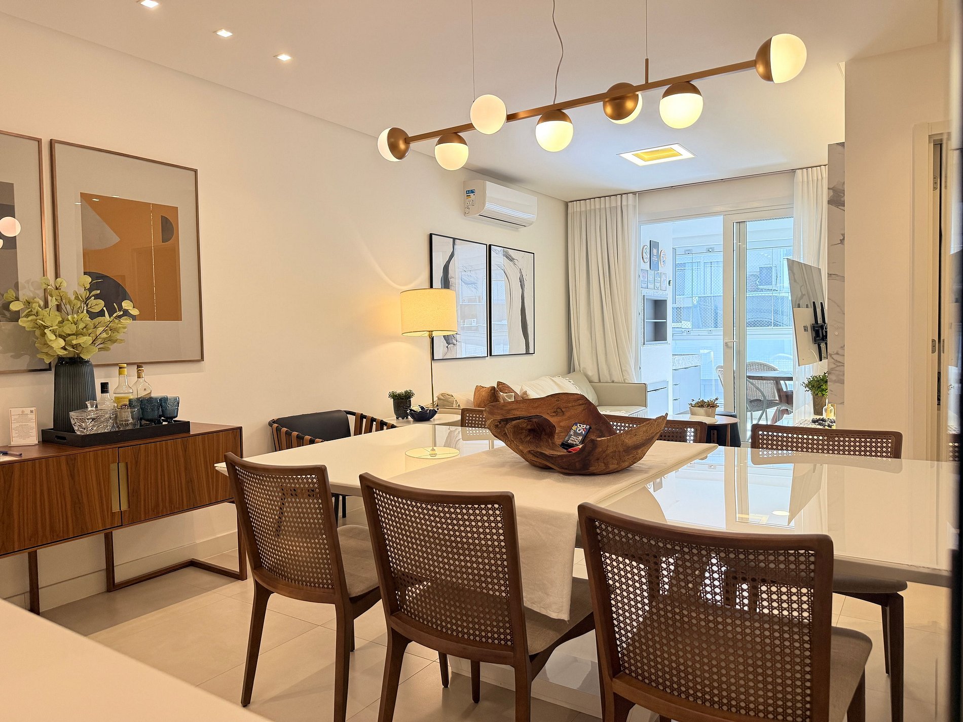 Sala de jantar com 6 lugares, em ambiente integrado com Sala de Estar e cozinha. Todos os ambientes são climatizados e com itens de altíssima qualidade.