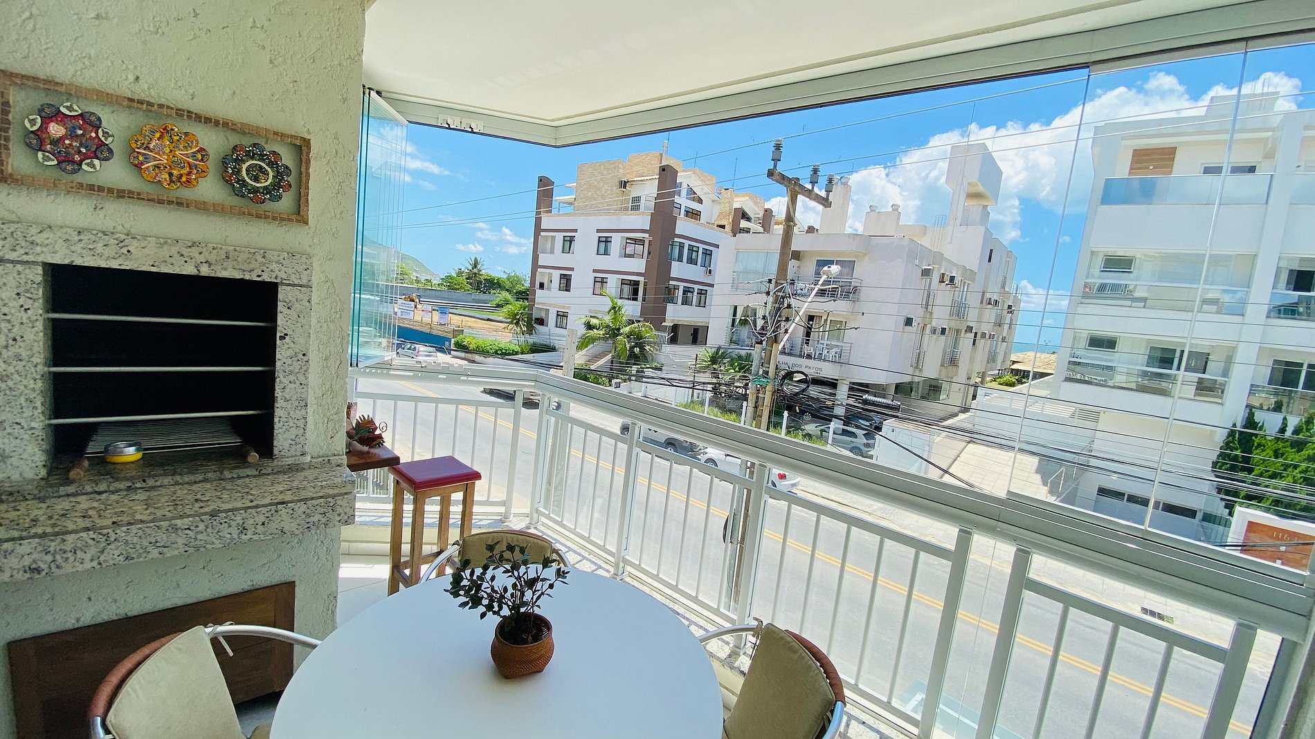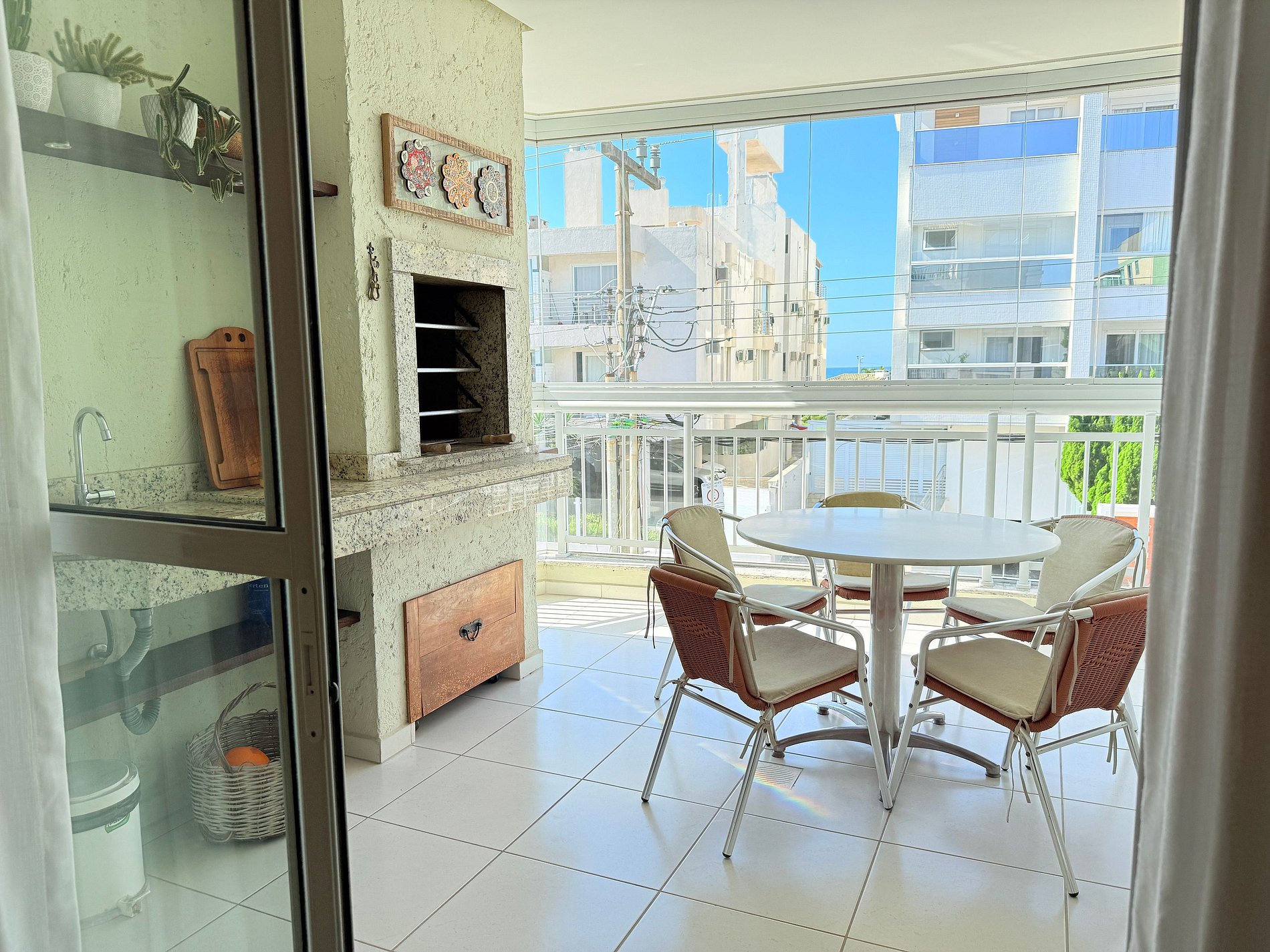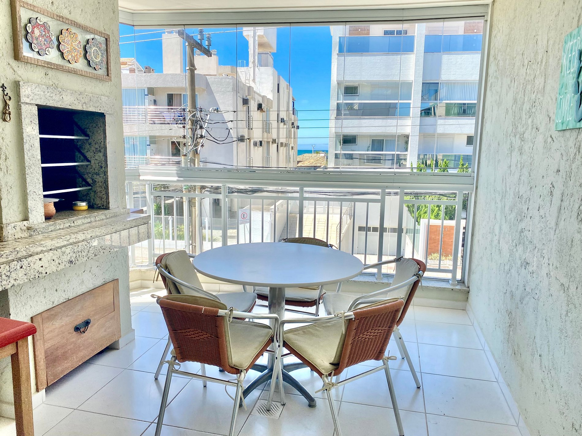 Varanda com churrasqueira, janelas em modo Reiki, e uma pequena vista do mar.