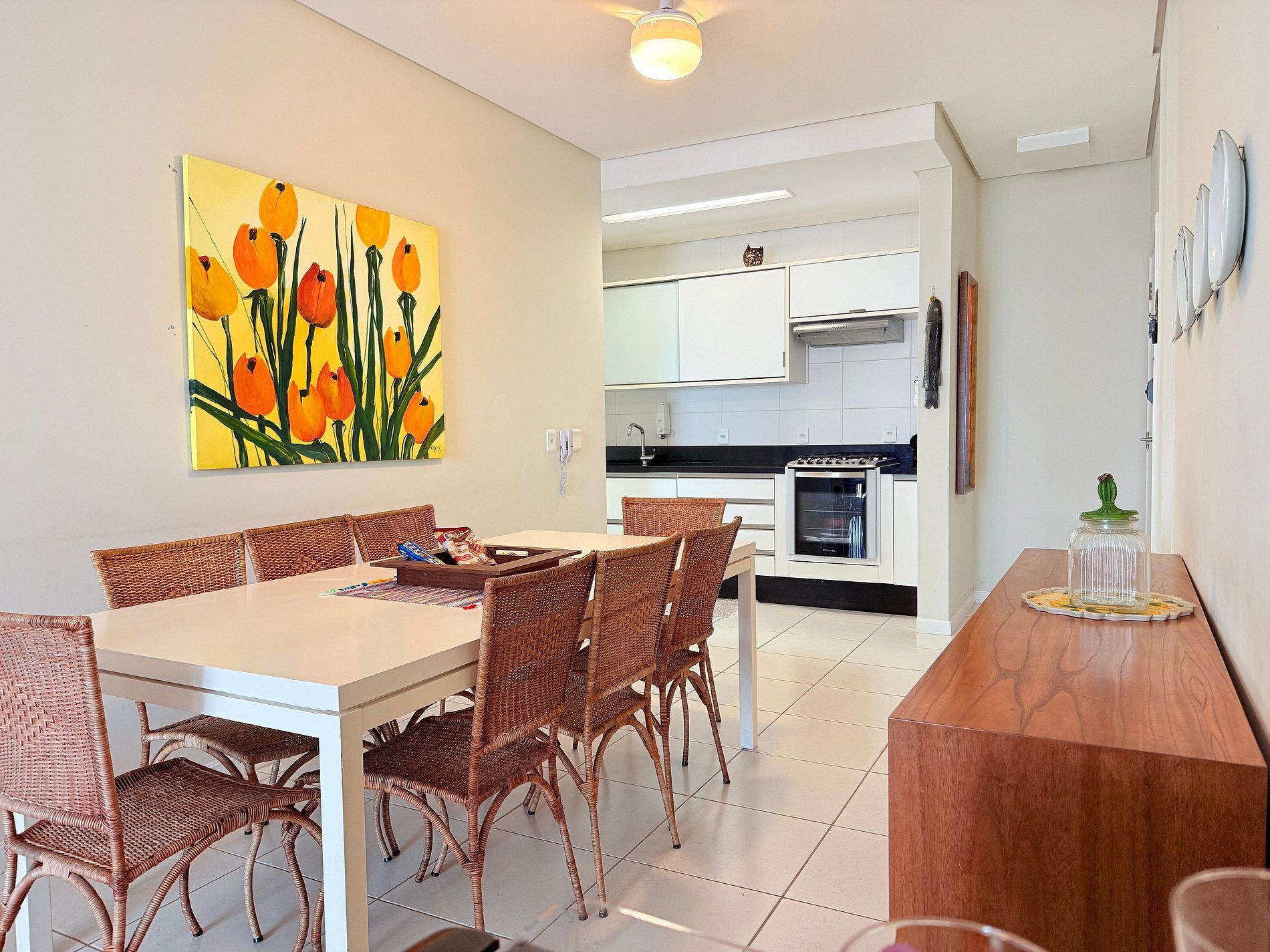 Sala de jantar ampla com mesa para 8 pessoas, cozinha + que completa, frigobar, e lavanderia com lava e seca. Na Sala tem TV, canais básicos e WI-Fi.