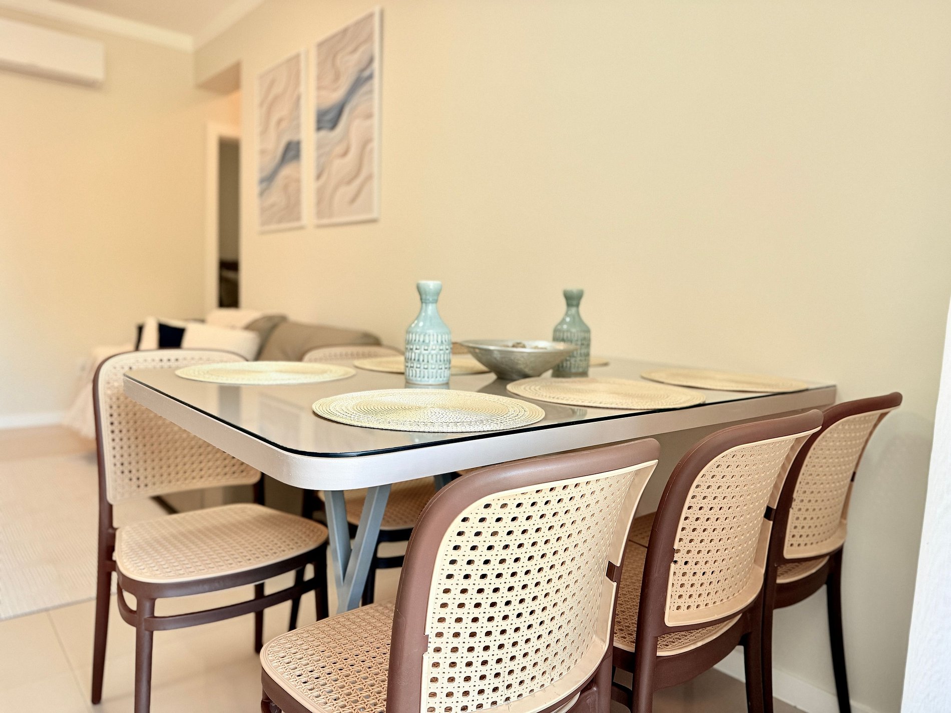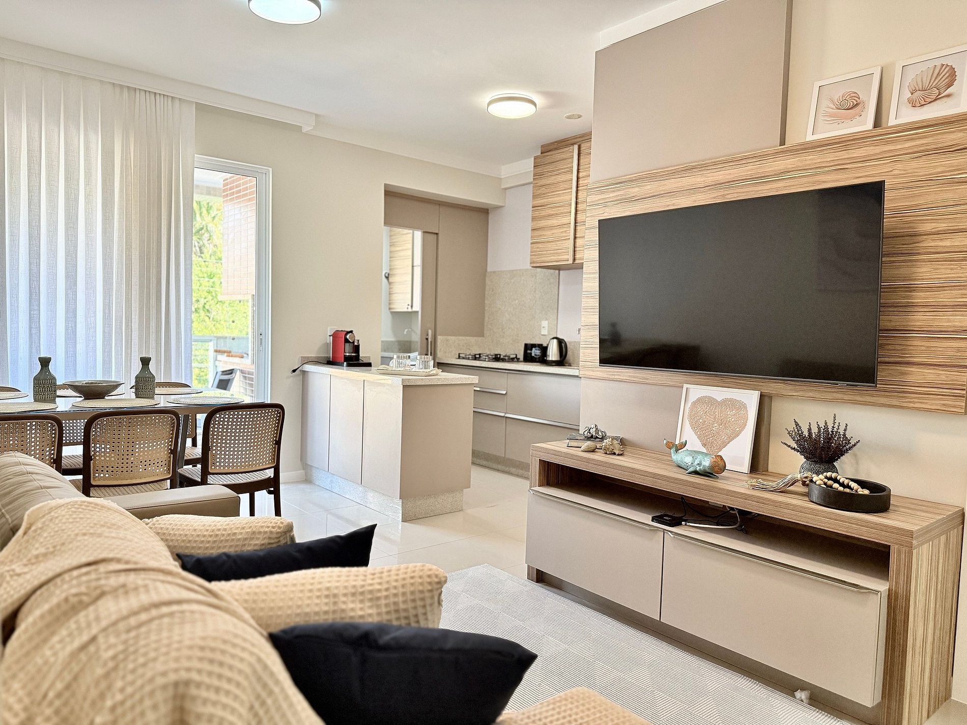 Sala de estar sala de jantar e cozinha conjugados em um ambiente confortável, iluminado, e preparado com todos os itens que oferecem praticidade a hóspedes que procuram um ambiente completo à beira-mar.Todos os ambientes climatizados. Também com lavadora de roupas, TV smart e Wi-Fi.