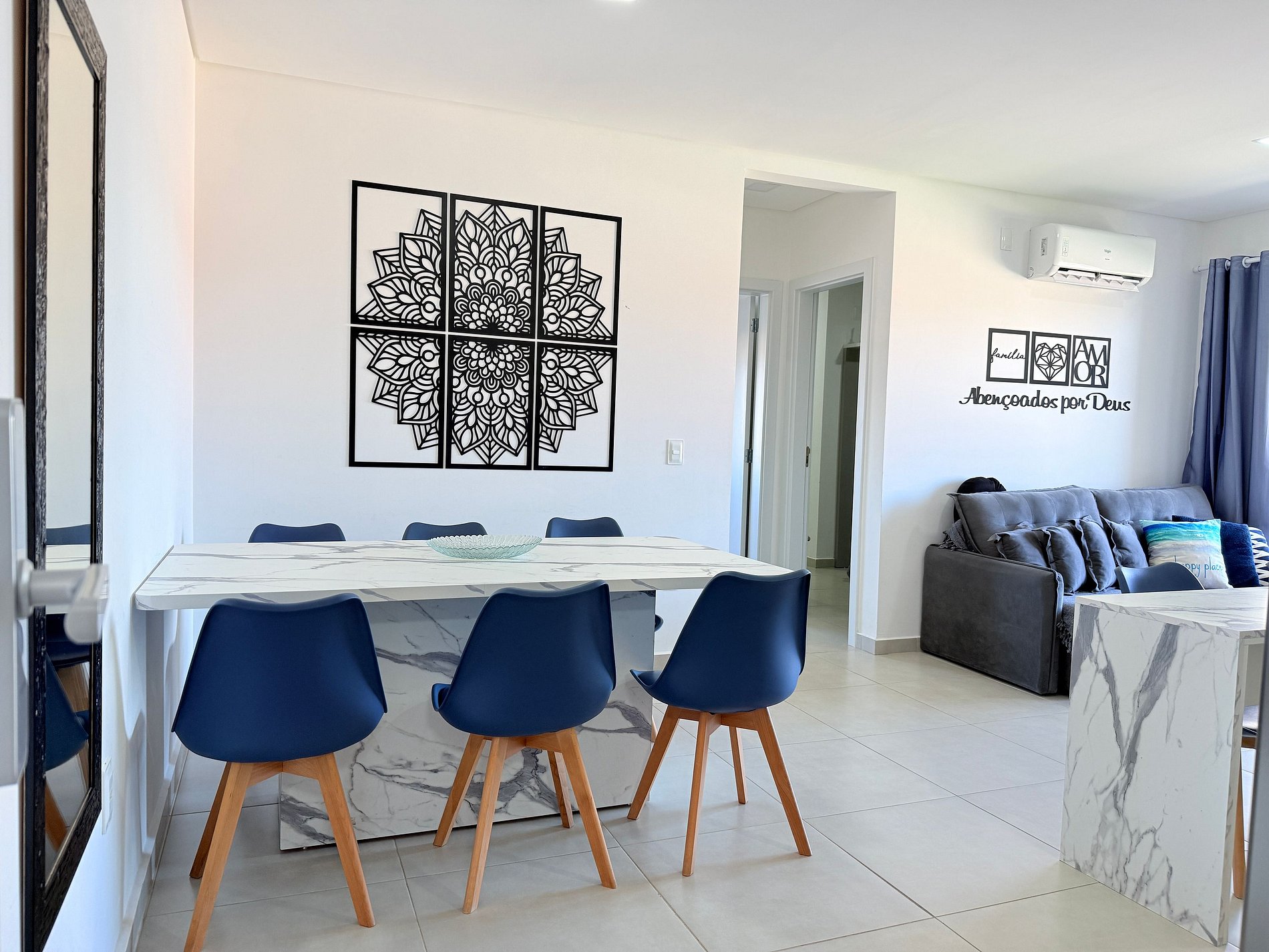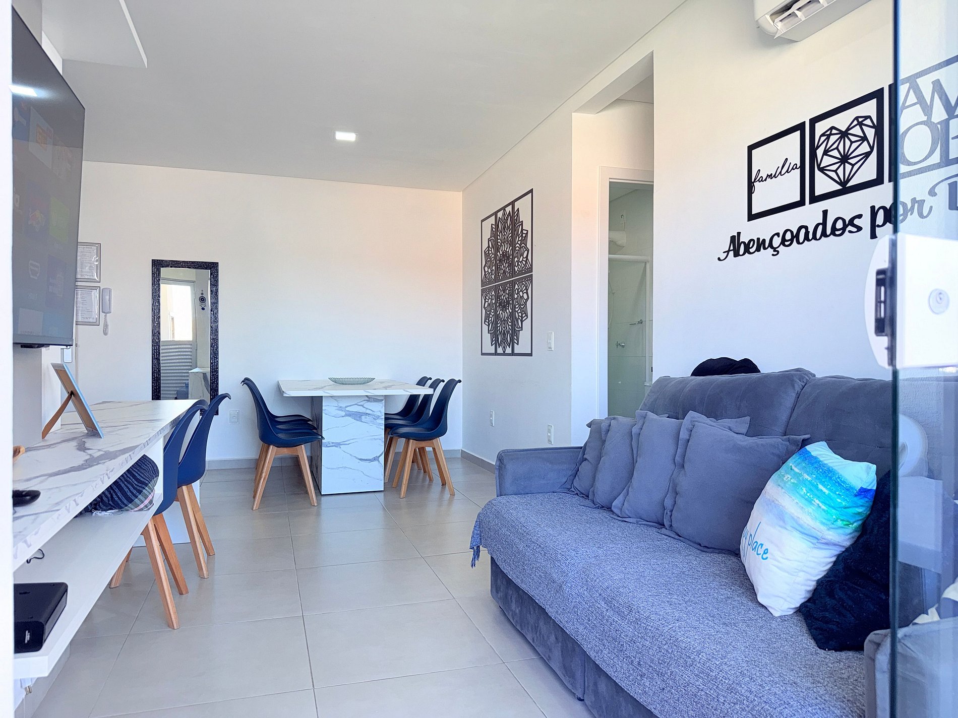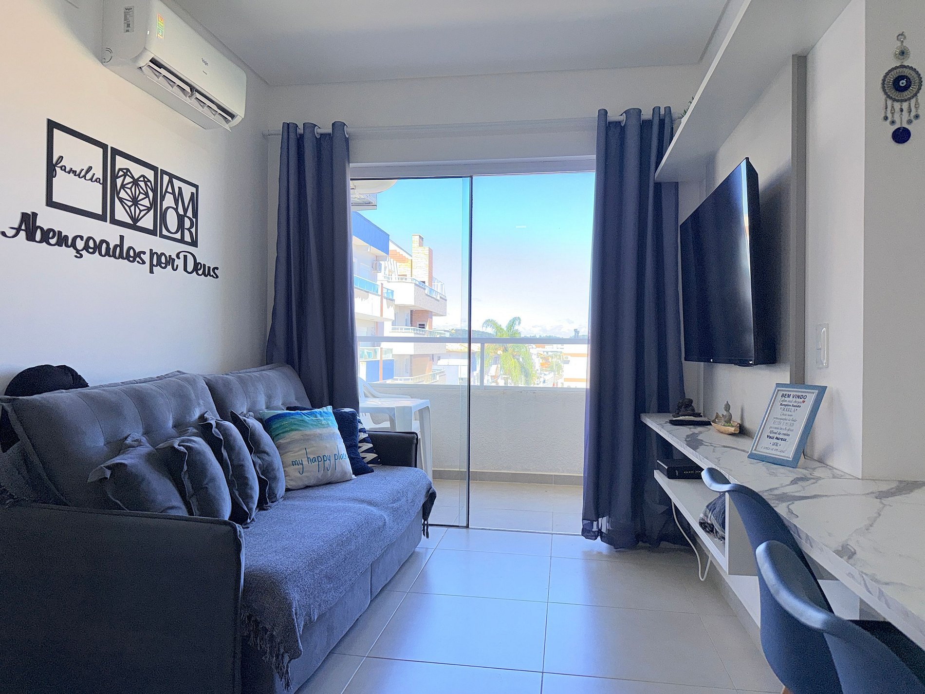 Apto novo a 400m da praia no centrinho. Próximo dos bares, restaurantes, farmácia e lojas. Apto 3 andar de frente c/churrasqueira e sacada. Dois quartos, sendo 1 suíte c/cama Queen e TV. Segundo quarto 2 camas solteiro e 1 auxiliar. Ar condicionado sala e quartos. Sala TV 50" Smart, canais e filmes liberados. Possui Wi-Fi e Sofá cama 2 lugares na sala. Cozinha completa e lavanderia com maq lavar roupa. Garagem 1 vaga. Acomoda até 5 pessoas.