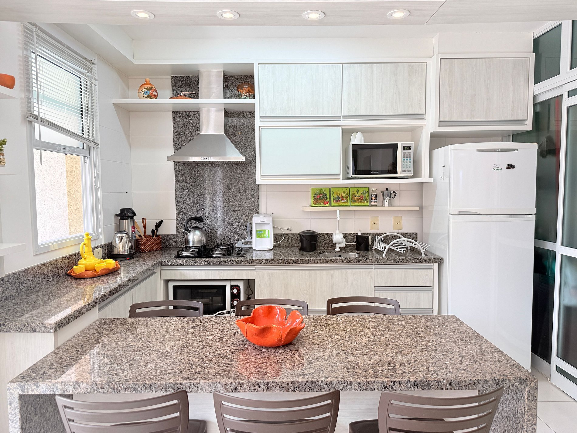 • Cozinha completa (fogão a gás, geladeira, micro-ondas, utensílios) para você preparar suas refeições com praticidade.