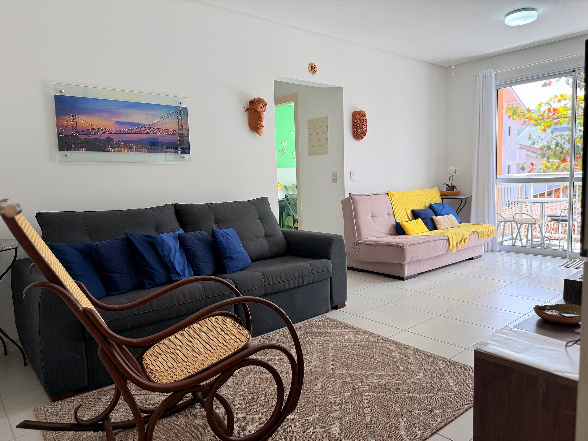 • Sala com sofá-cama, TV com canais de streaming, Wi-Fi e ambiente integrado com a cozinha.