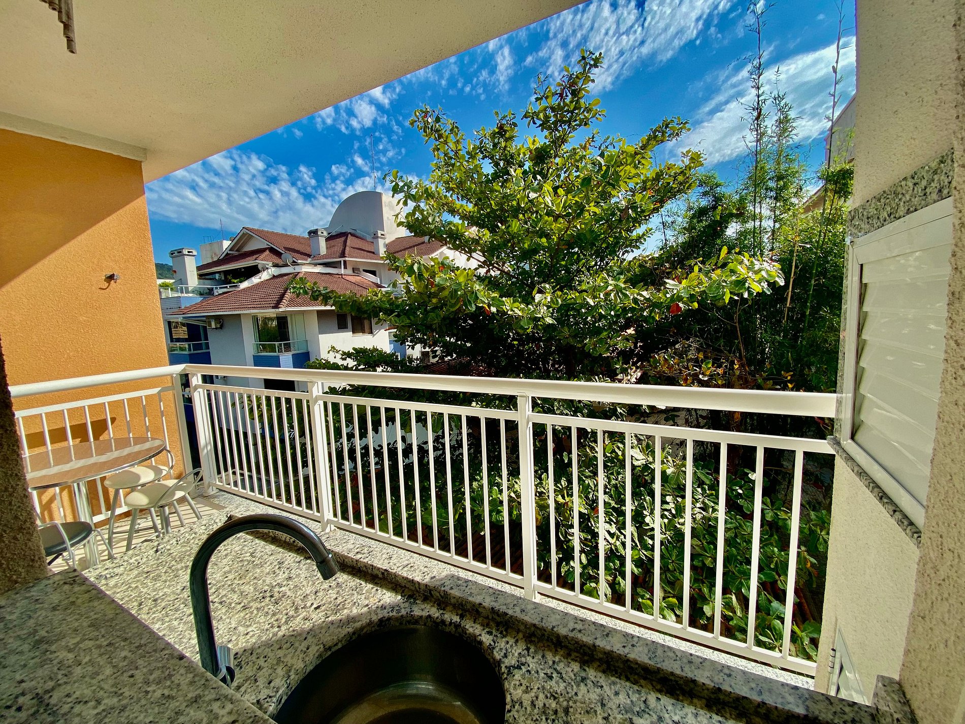 Destaque especial: varanda com churrasqueira e uma vista relaxante para as montanhas – o convite perfeito para aquele churrasquinho depois da praia.