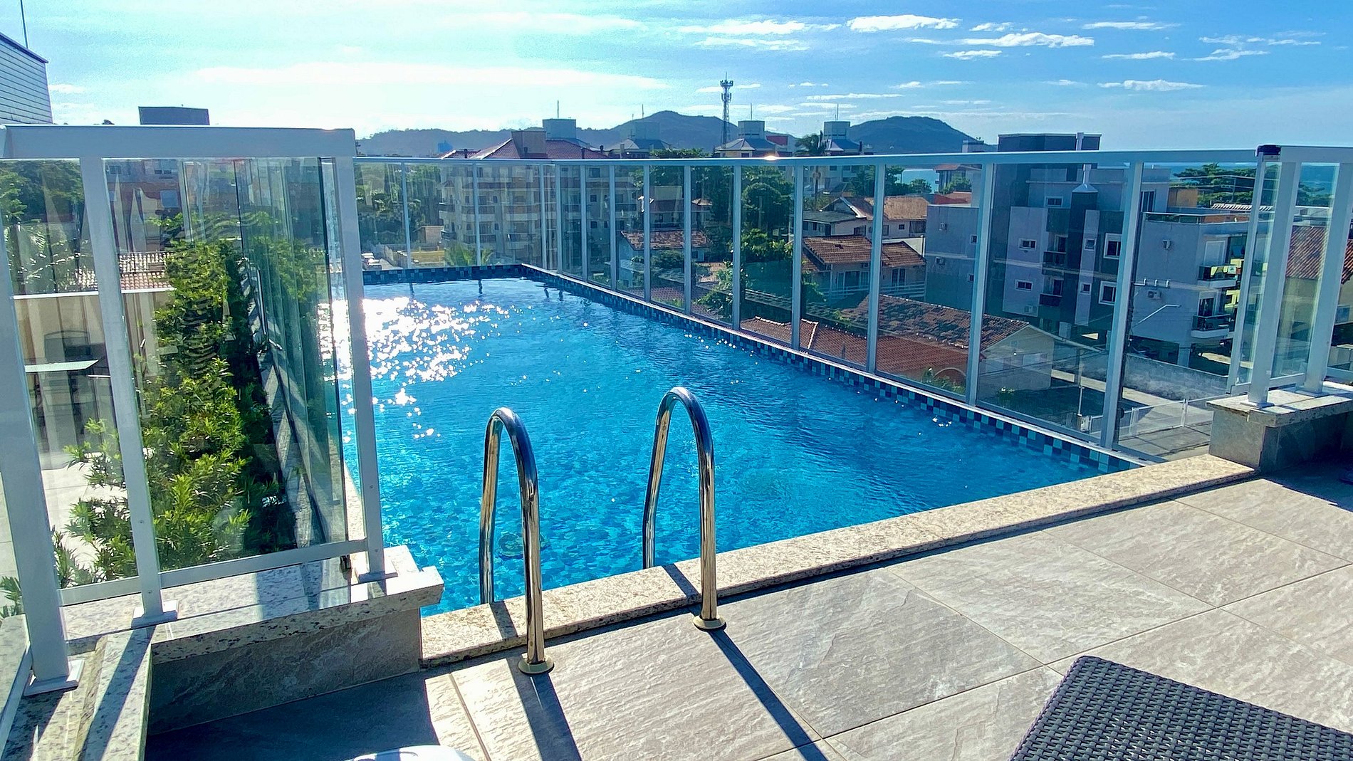Um espaço seguro, clean, completo, novo, iluminado, com piscina e próximo da praia.