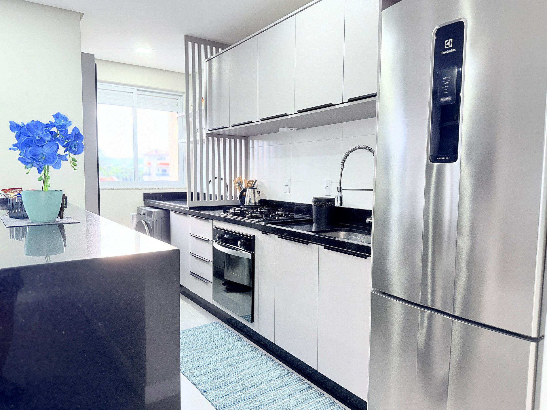 Cozinha completa, bem equipada com todos os novos aparelhos, copos de cerveja, água e vinho, todos os utensílios de panelas e frigideiras e muito mais; lavanderia com lavadora/secadora e equipamento extra para facilitar sua estadia.