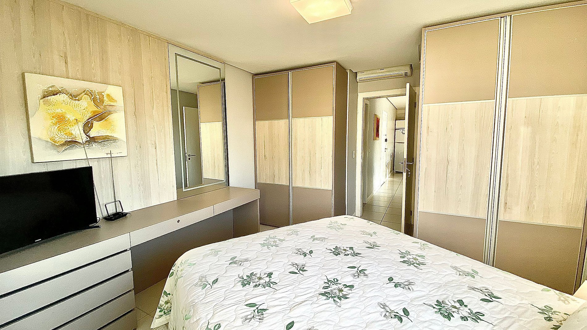 Dois dormitórios sendo uma suíte cama queen com ar-condicionado, TV, roupeiros, vista romântica do mar e montanha.