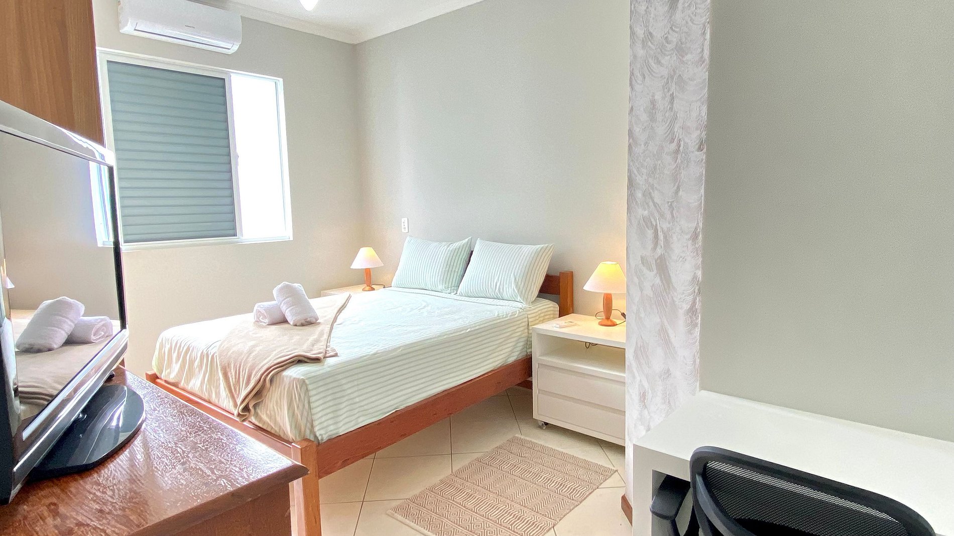 Esse espaço simples e aconchegante tem dois quartos, sendo 1 suíte com cama casal , e quarto de solteiro com 2 camas, ar-condicionado split nos dois quartos, sala com sofá cama ( duas camas solteiro) e varanda com churrasqueira.