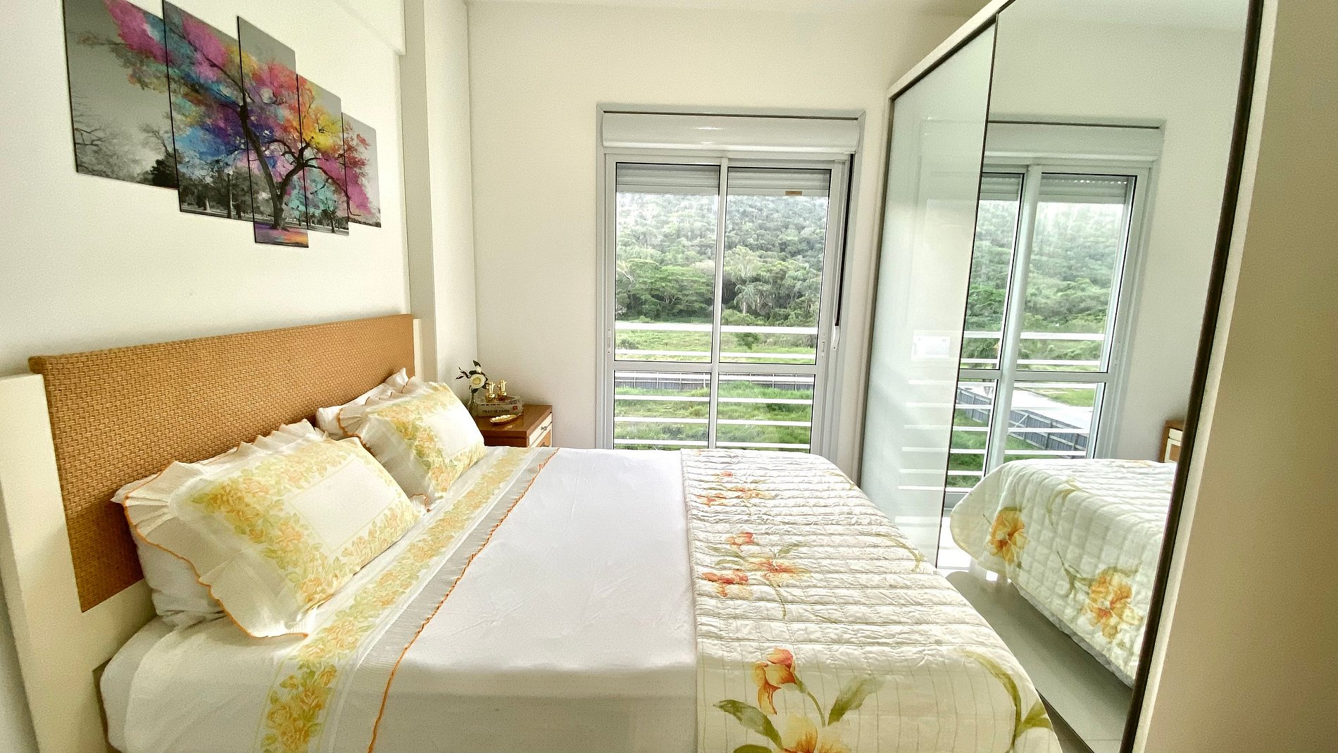 Recém anunciado, porém gerenciado pelas experientes anfitriãs da Ilha da Magia. (Perfil) Apartamento 2 quartos, sendo uma suíte com cama queen, roupeiro e ar-condicionado. E uma vista única para a montanha. Segundo quarto com 2 camas solteiro, roupeiro e também ar-condicionado. E + um banheiro. Todas as torneiras com água quente. Sala com sofá reclinável e TV canais básicos e Wi-Fi. Varanda com churrasqueira virada para as montanhas. Cozinha bem equipada com utensílios essenciais. Sala de jantar para reunir toda a família. E lavanderia com lavadora. Vaga de garagem subsolo. Residencial 2 blocos da praia. Perto de da famosa sorveteria italiana, 2 quadras do mercado Beto. E um quilômetro e meio do centrinho dos Ingleses.