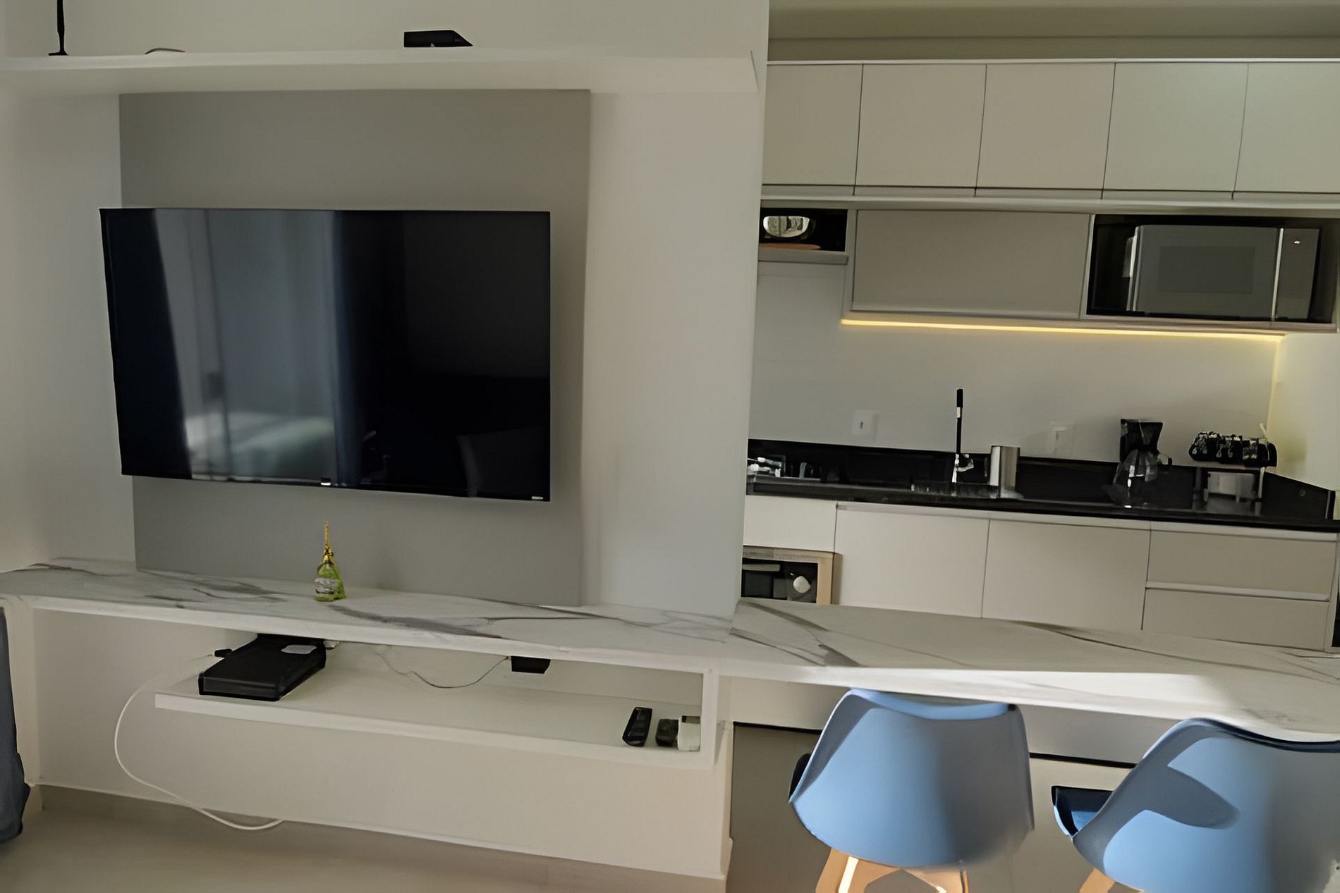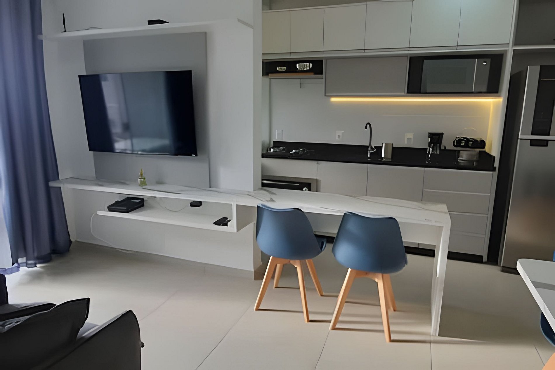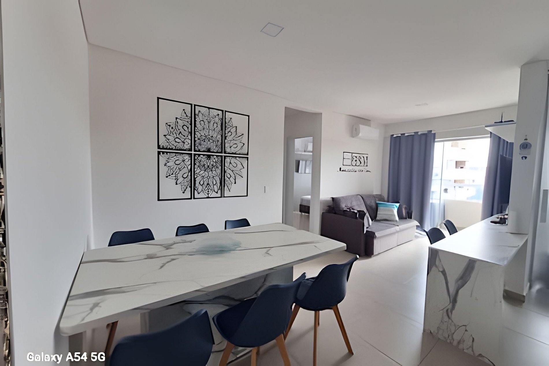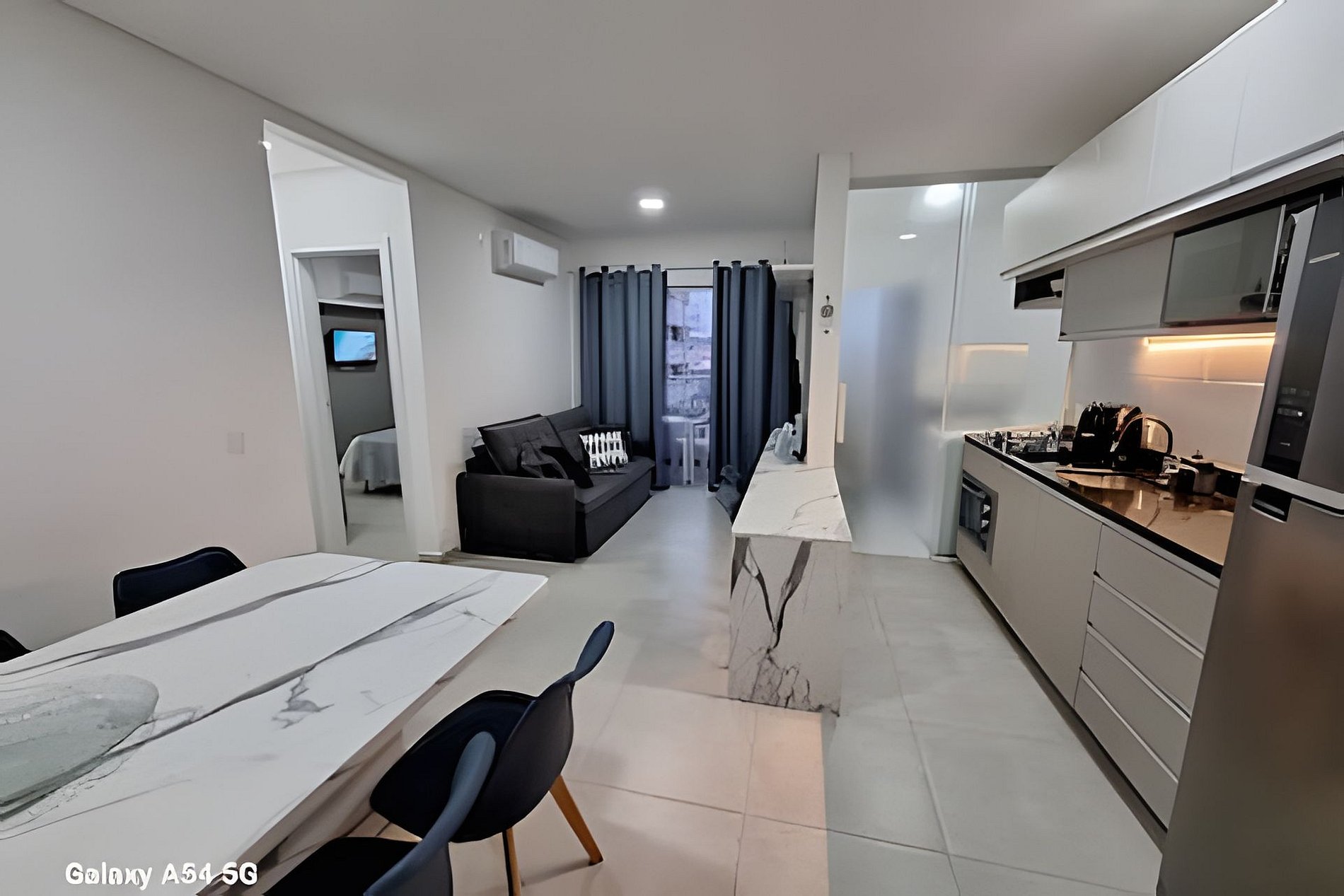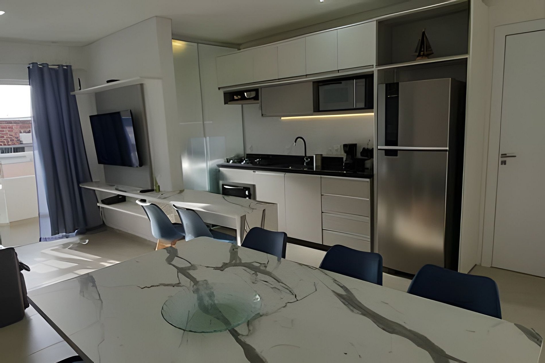 Apto novo a 400m da praia no centrinho. Próximo dos bares, restaurantes, farmácia e lojas. Apto 3 andar de frente c/churrasqueira e sacada. Dois quartos, sendo 1 suíte c/cama Queen e TV. Segundo quarto 2 camas solteiro e 1 auxiliar. Ar condicionado sala e quartos. Sala TV 50" Smart, canais e filmes liberados. Possui Wi-Fi e Sofá cama 2 lugares na sala. Cozinha completa e lavanderia com maq lavar roupa. Garagem 1 vaga. Acomoda até 5 pessoas.