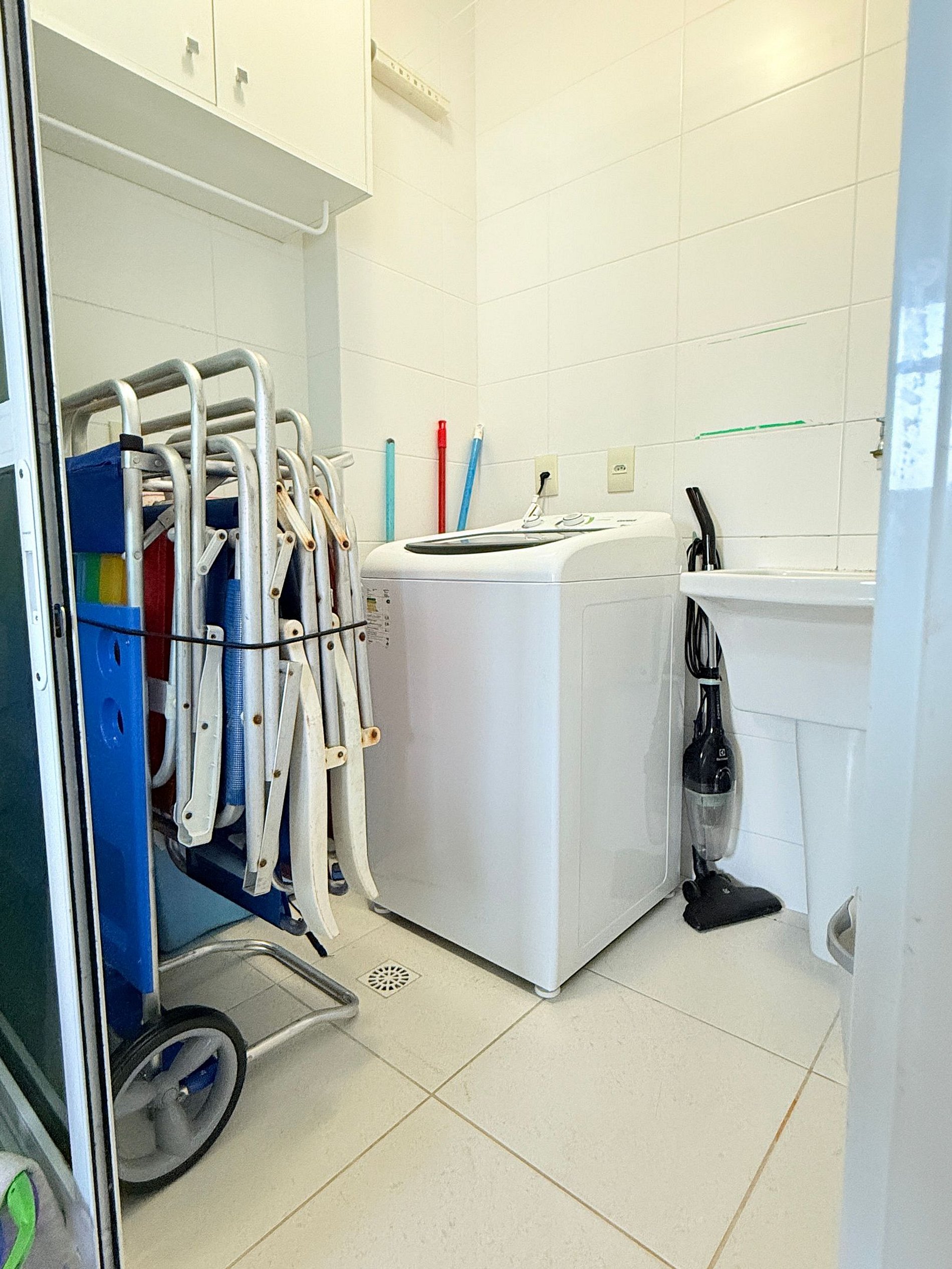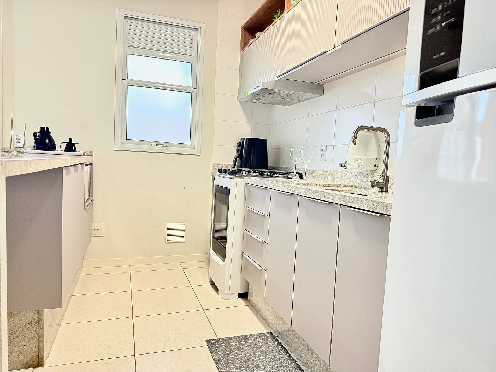 A cozinha é completa, equipada com fogão a gás, geladeira, micro-ondas, cafeteira, batedeira e todos os utensílios necessários para preparar suas refeições. Conta também com lavanderia com máquina de lavar.