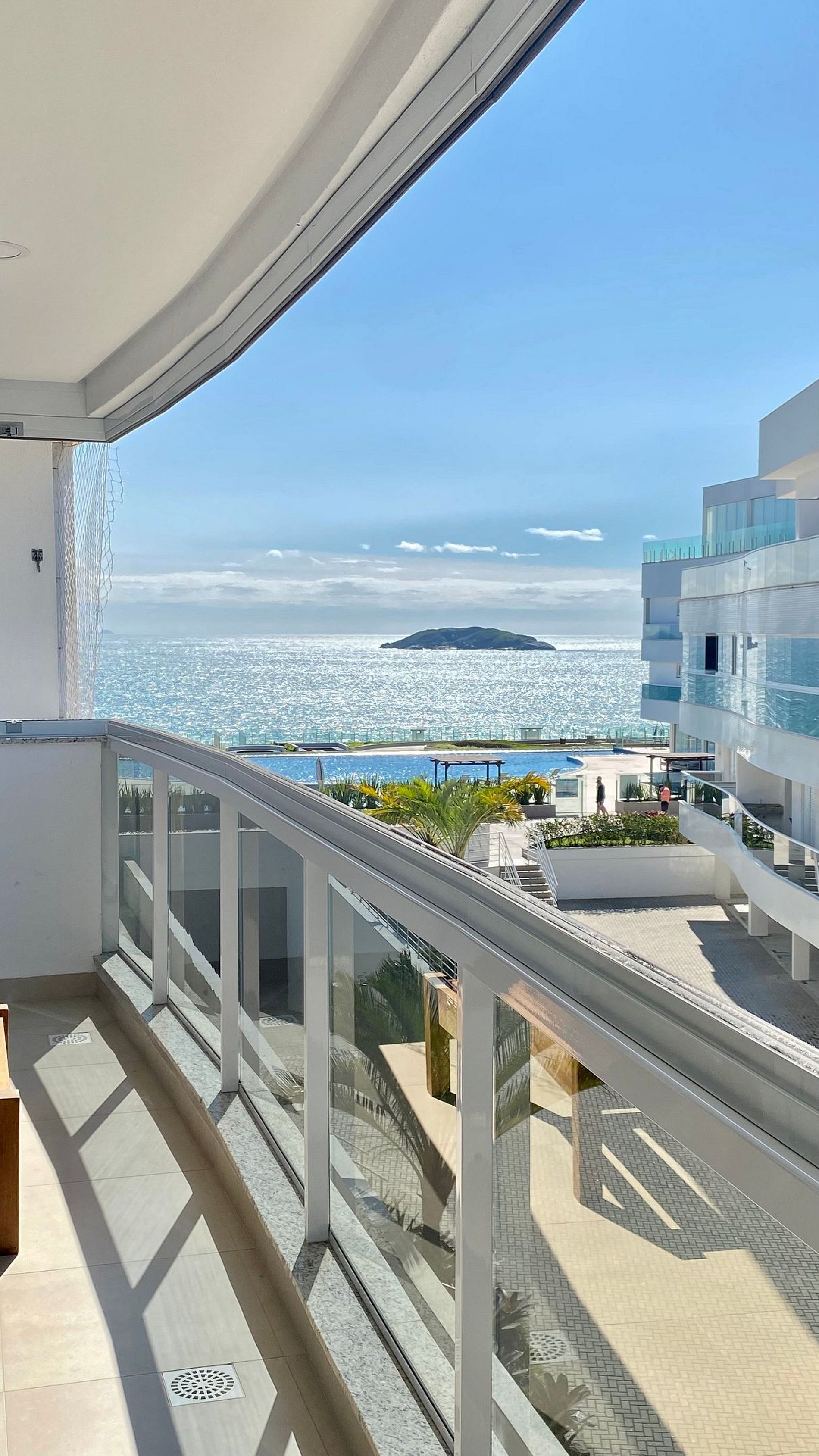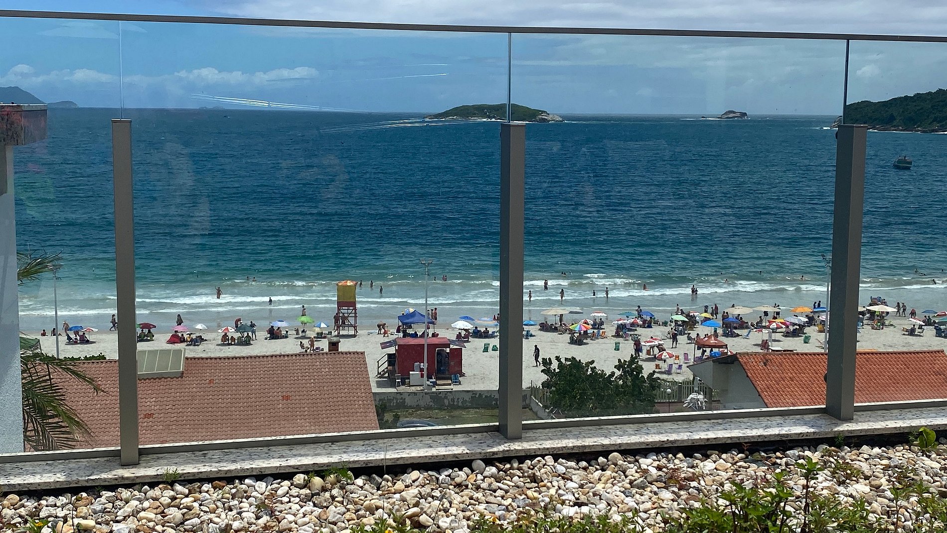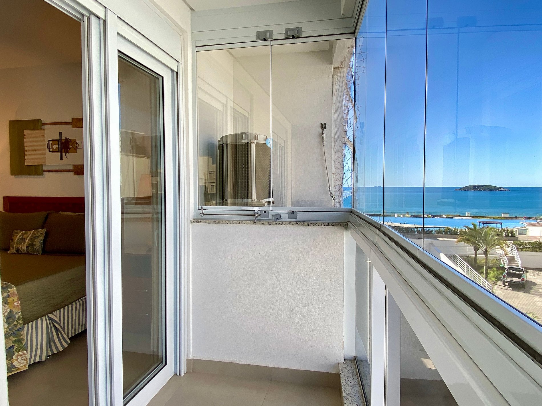Varanda ampla, e uma privilegiada vista para a área da piscina e mar. Fechada em vidros movíveis, podendo abrir para ventilar e curtir a paisagem, e manter fechado em dias chuvosos, completando o conforto para hóspedes exigentes. com churrasqueira.
