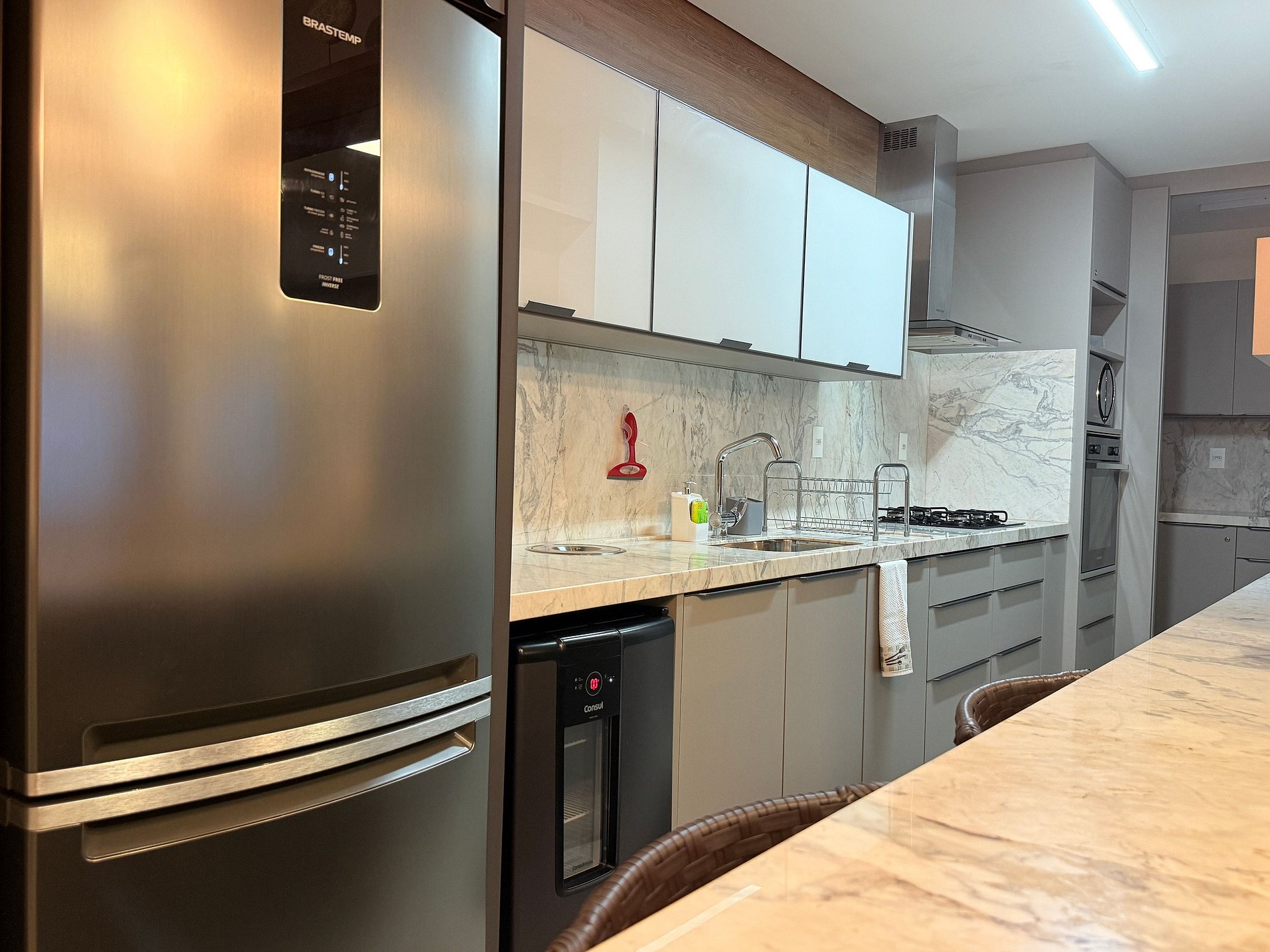 Cozinha bem equipada com eletrodomésticos, armários sob medida, cooktop e e adega para vinho.