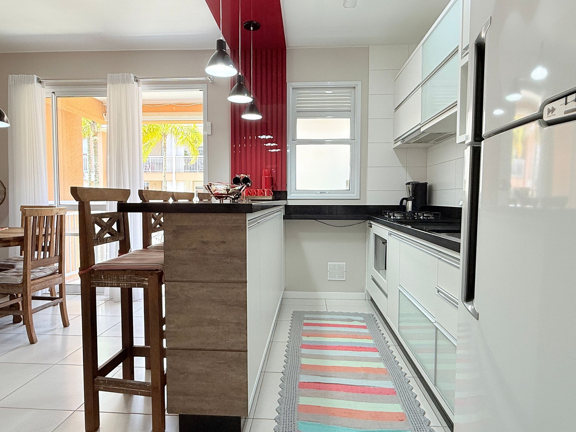 O espaço oferece 2 quartos, sendo uma suíte com cama queen, uma lista vista para as montanhas, ar-condicionado e TV à cabo. Segundo quarto com 2 camas box solteiro que podem virar cama casal+ 2 colchões extras. Sala de estar com sofá cama, TV Smart e canais à cabo, bem como internet Wi-Fi, ambiente conceito aberto em sala de jantar e cozinha cozinha completa, sem falar muito bem planejada. 2 W/C, varanda para o interior do condomínio com uma tranquilizante e alegre vista para a piscina e as montanhas. Vaga de garagem para 1 carro, porém bastante espaço na frente do condomínio.