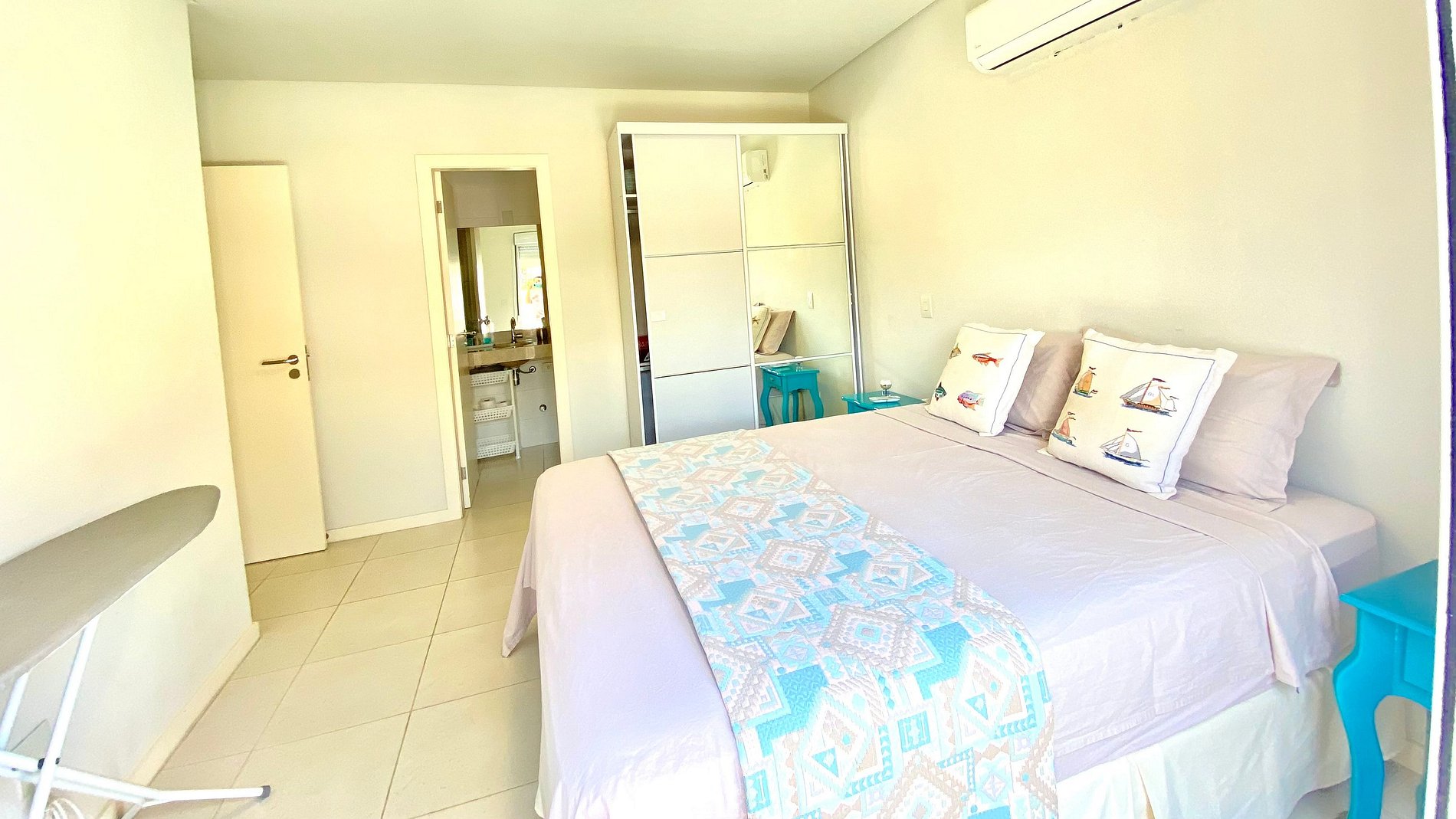 Amplo, com 2 quartos sendo uma súite cama queen, e quartos solteiro com 2 camas box que podem virar casal, ambos com ar-condicionado e mais um banheiro social.