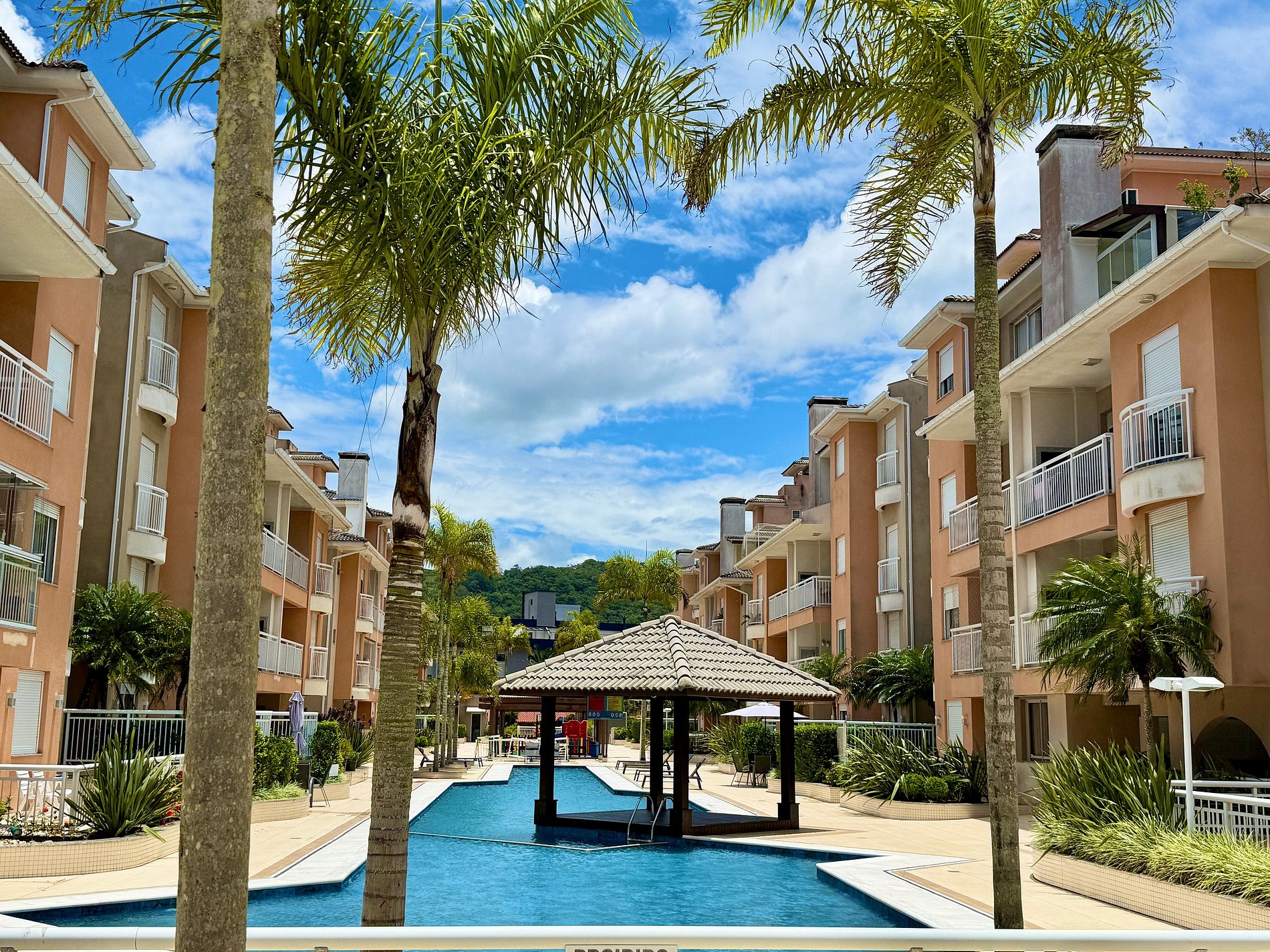 Condomínio localizado entre o mar e a montanha com uma piscina recém revitalizada localizada estrategicamente no meio do condomínio, surpreendendo à todos que ali entram. Piscina enorme com lado razo, médio e fundo, em meio à palmeiras, vista para a montanha e muito ensolarada. Localizado na área dos Ingleses Norte, esquina com a Rua das Gaivotas, área muito bem planejada com ruas largas, ambiente familiar e tranquilo. Com portaria 24 hrs.