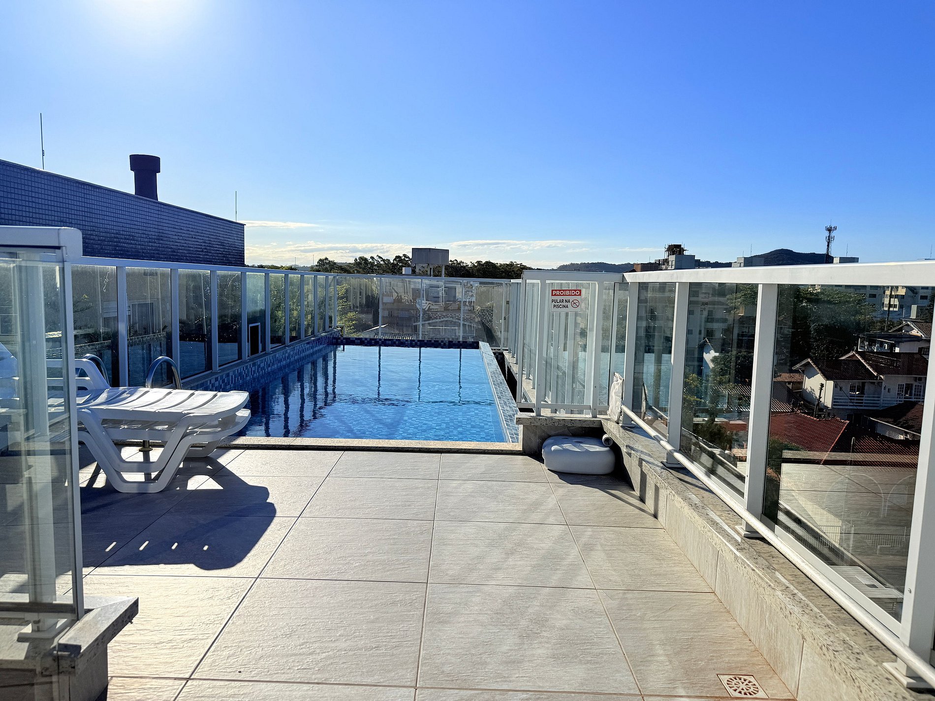 Um espaço seguro, clean, completo, novo, iluminado, com piscina e próximo da praia.
