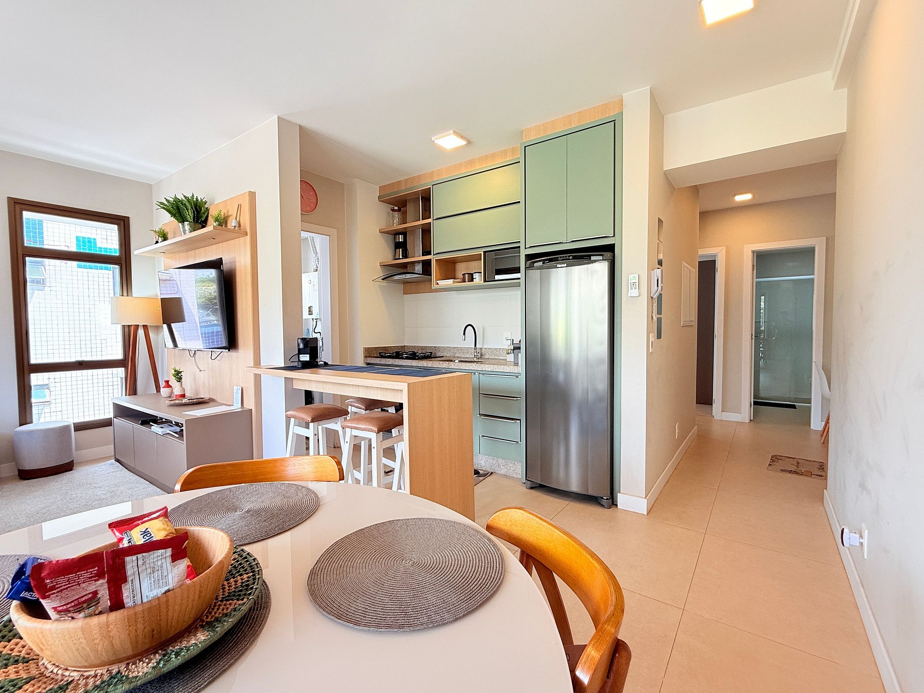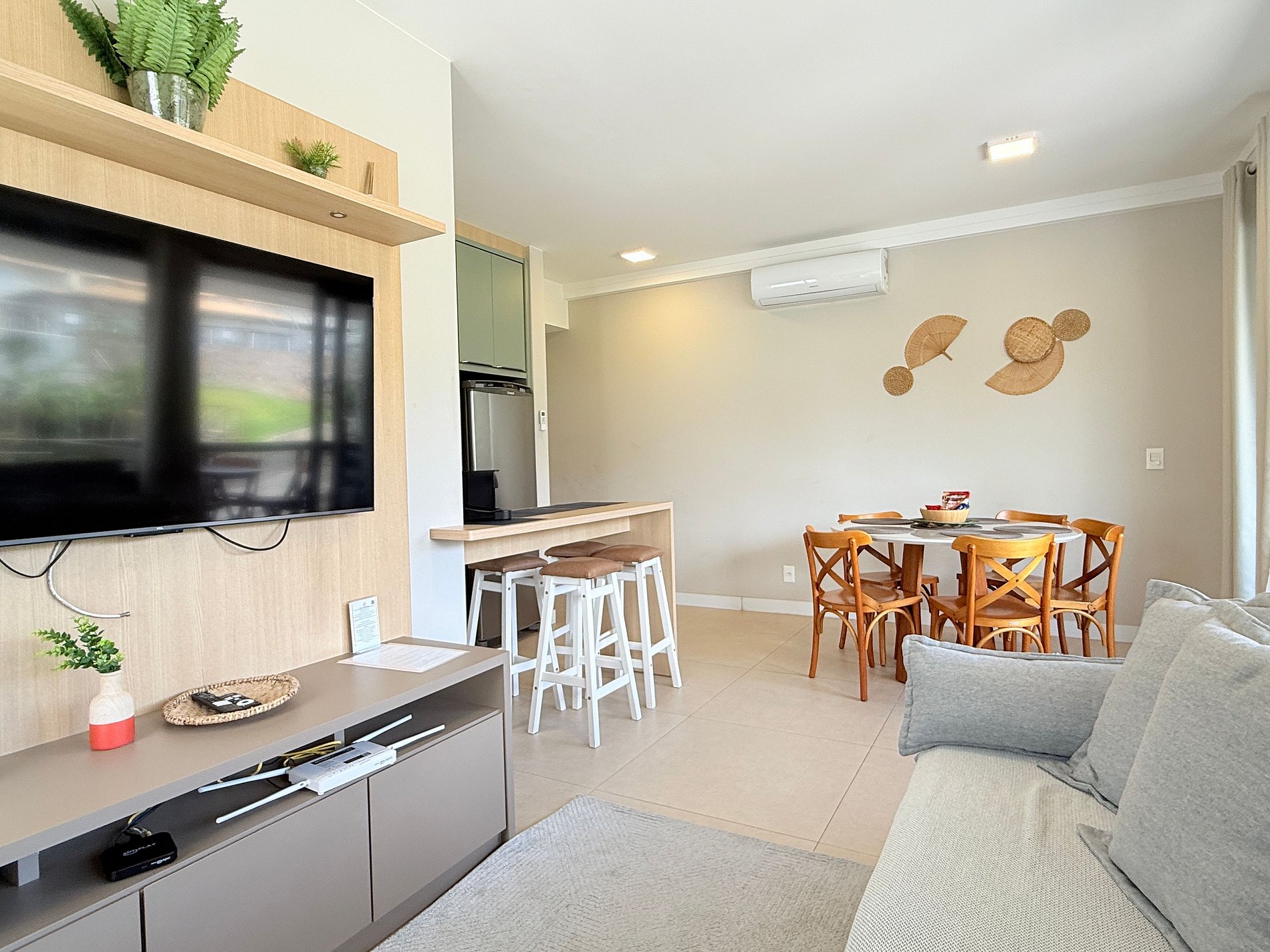 Sala de estar com TV Smart e Wi-Fi, sala de jantar e cozinha em ambiente conjugado, facilitando a reunião familiar.