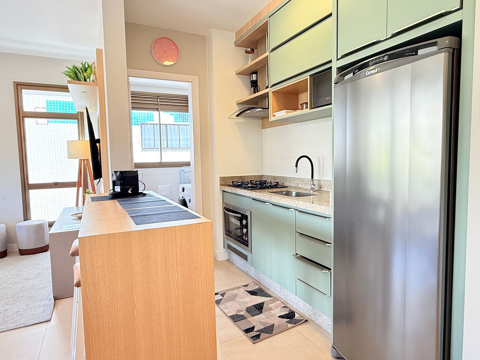 Cozinha bem equipada onde você encontra o necessário para fazer um delicioso jantar, ou um churrasco na varanda com churrasqueira.