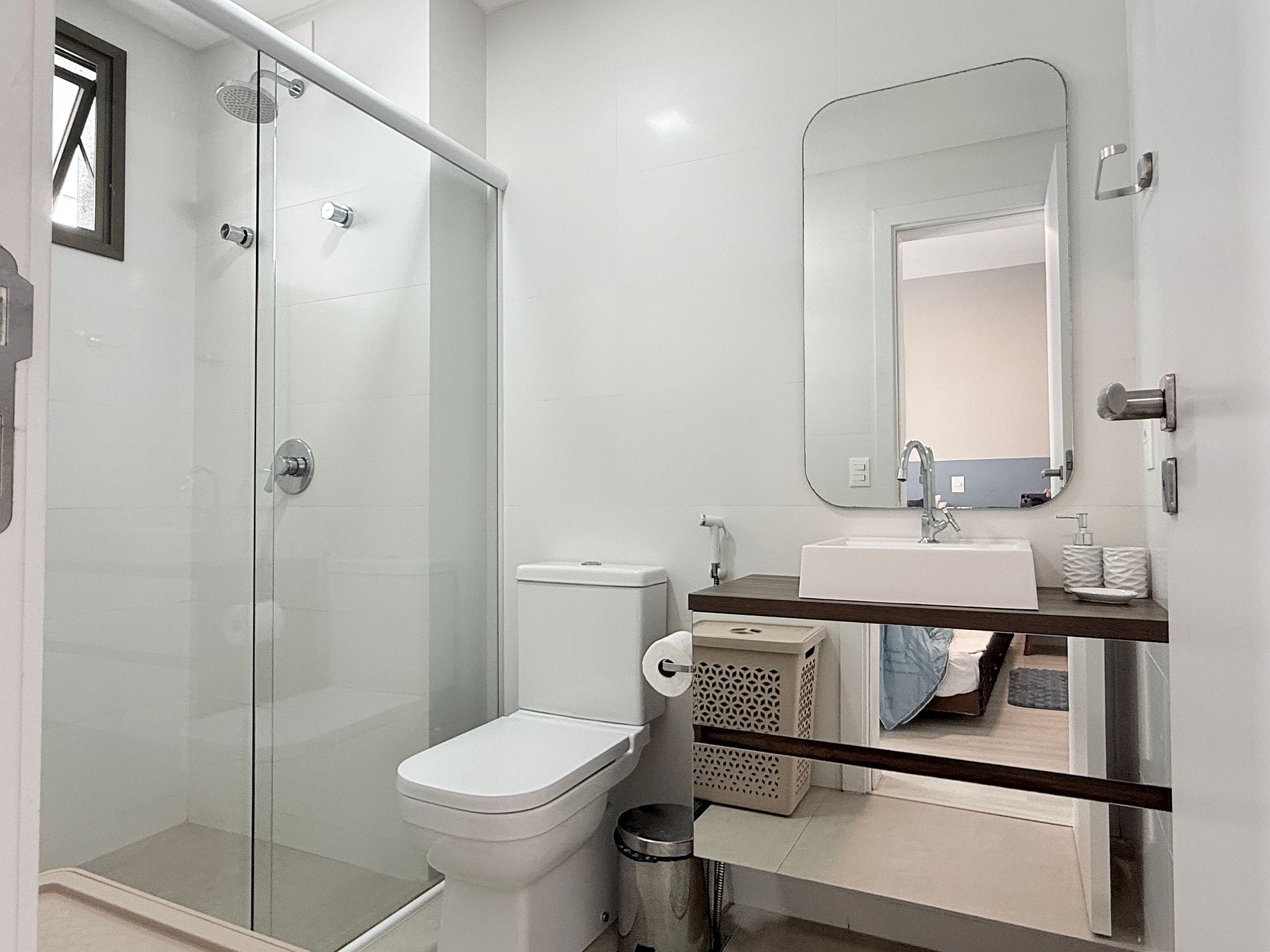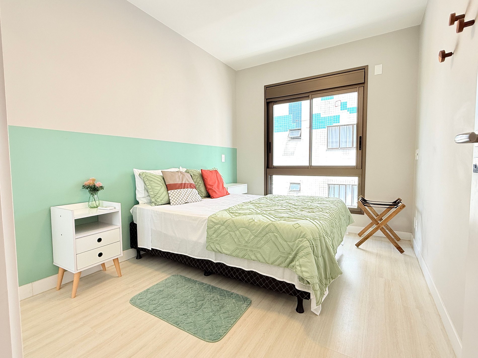 Apartamento 2 quartos sendo uma suíte com cama queen + duas camas auxiliares (em baixo da cama) que podem ser levadas à sala.