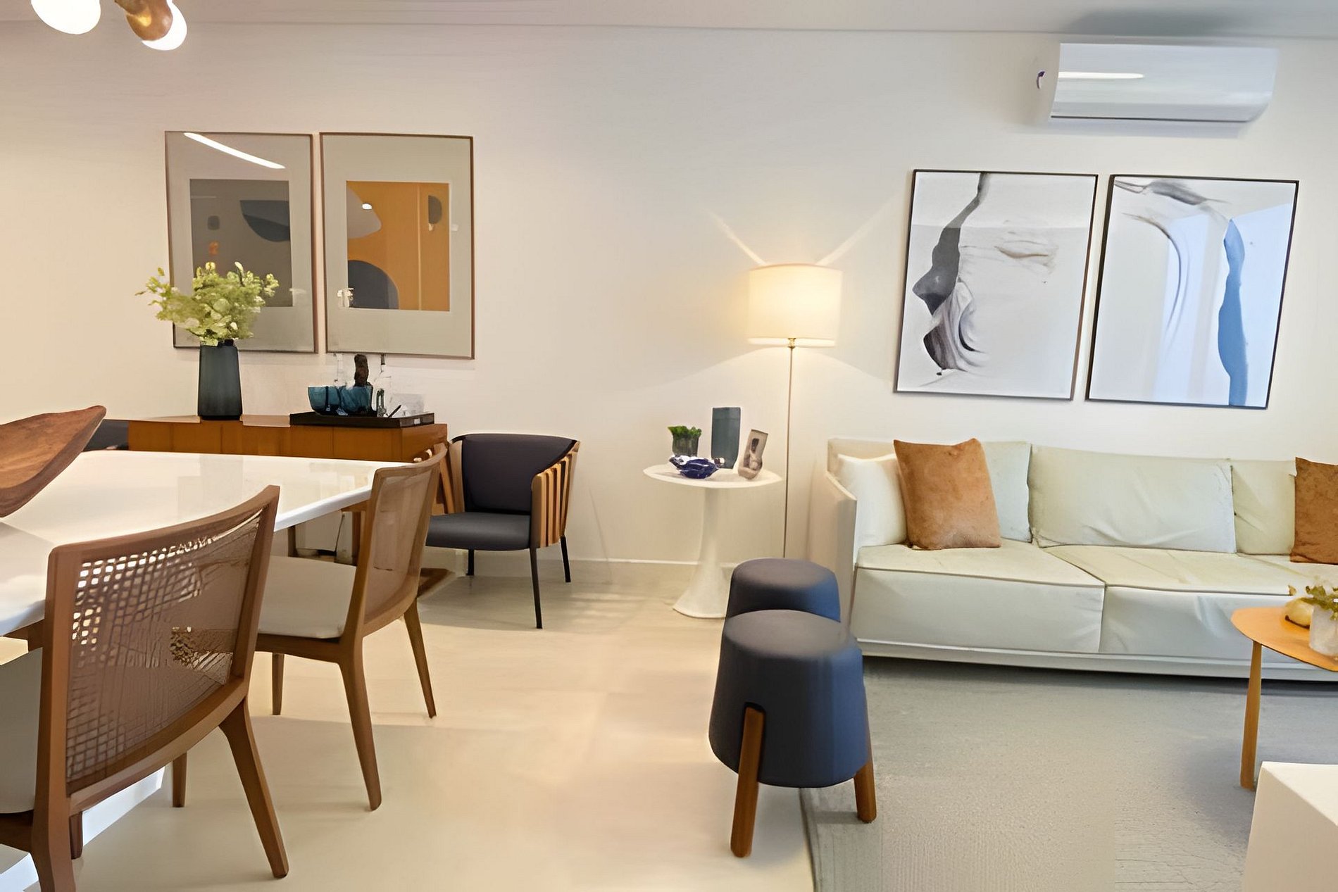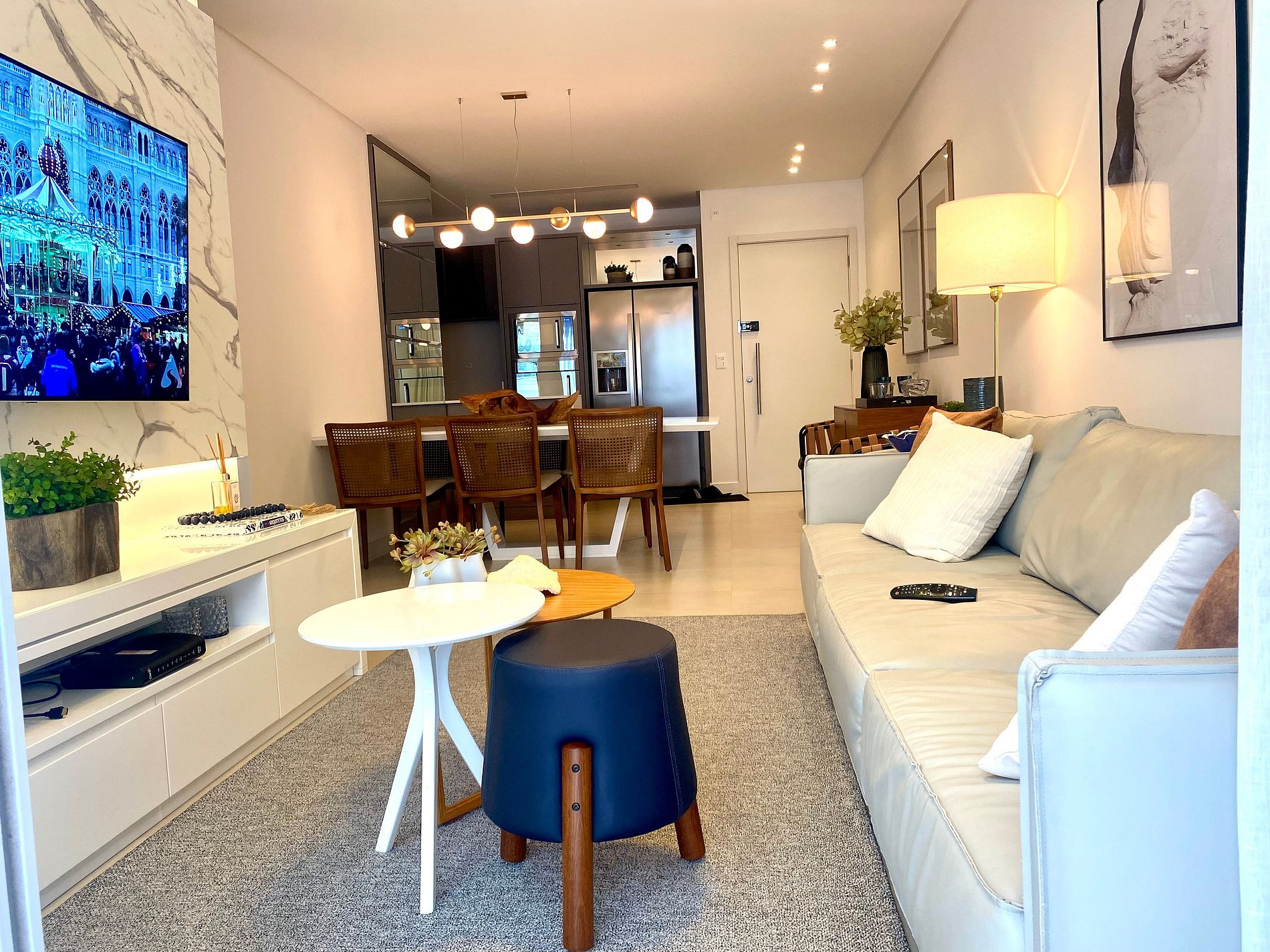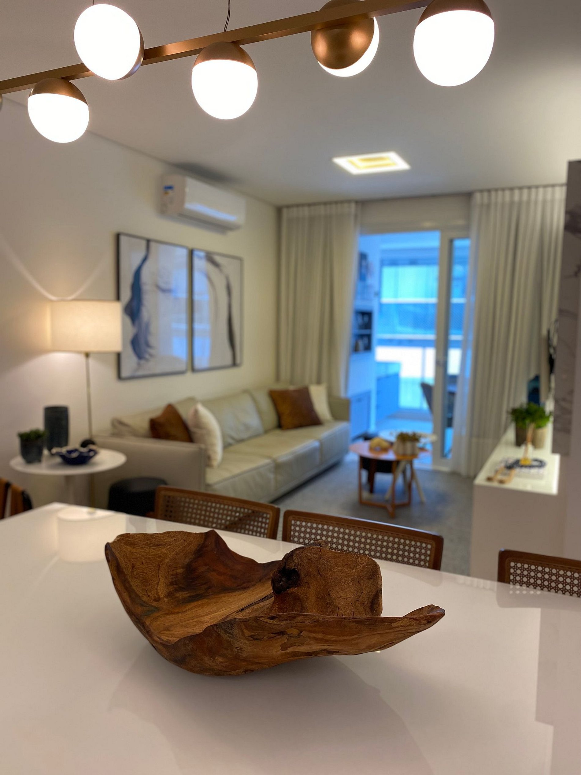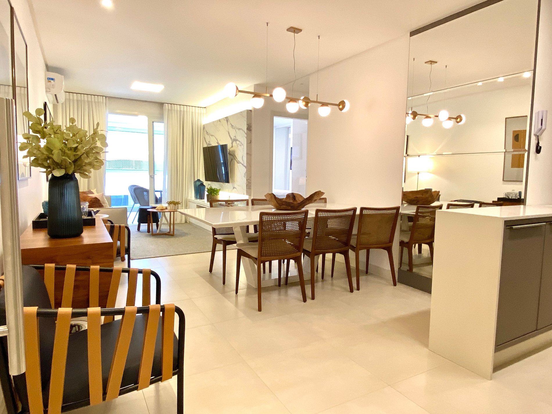 Sala de jantar com 6 lugares, em ambiente integrado com Sala de Estar e cozinha. Todos os ambientes são climatizados e com itens de altíssima qualidade.