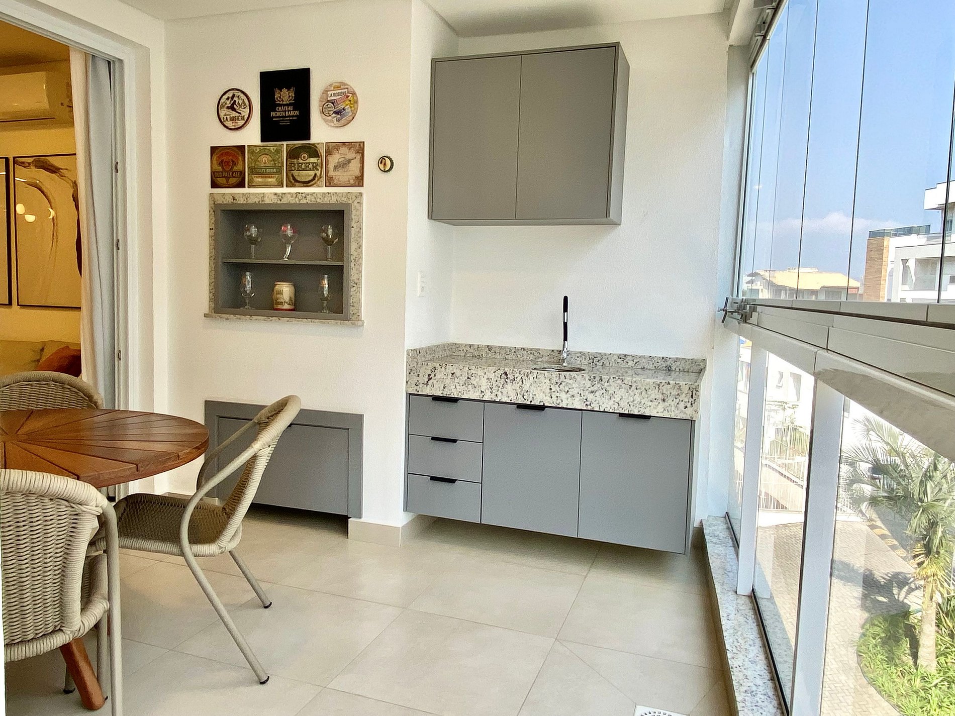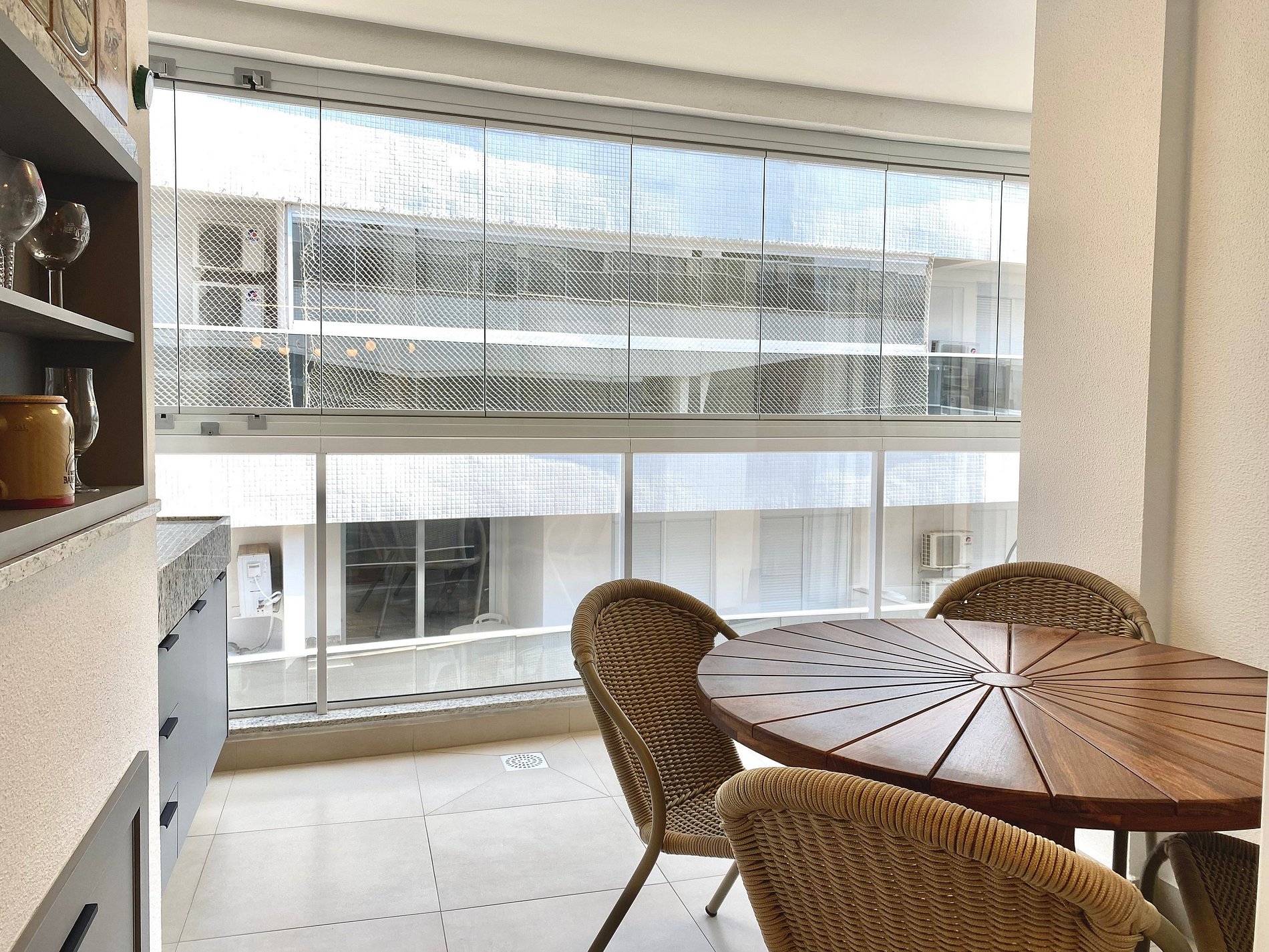 Lavanderia com lava e seca e varanda com churrasqueira, fechada com vidros que podem ser abertos.