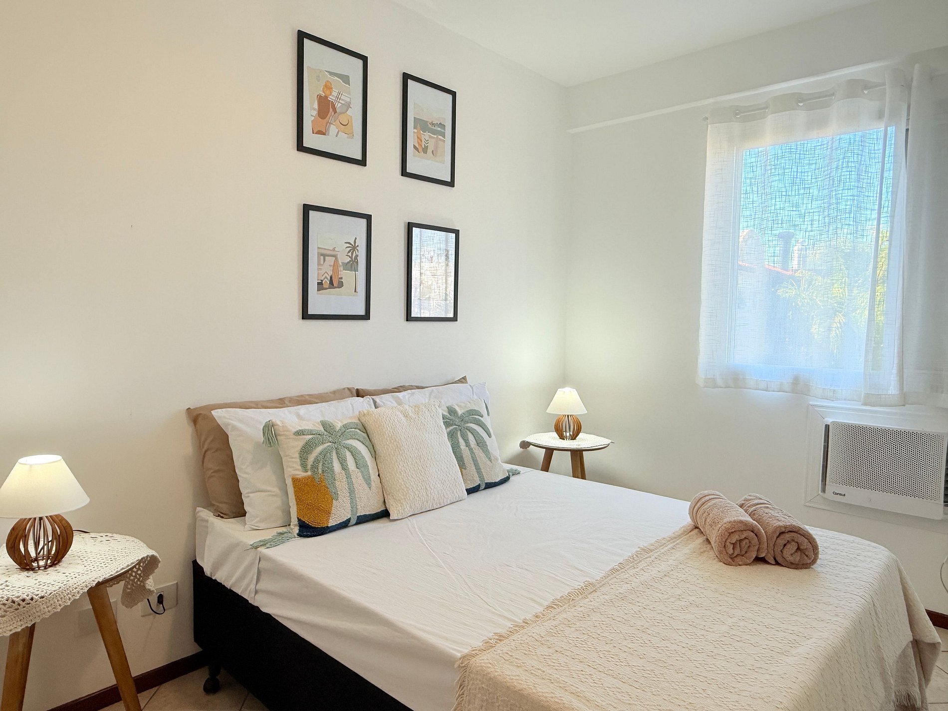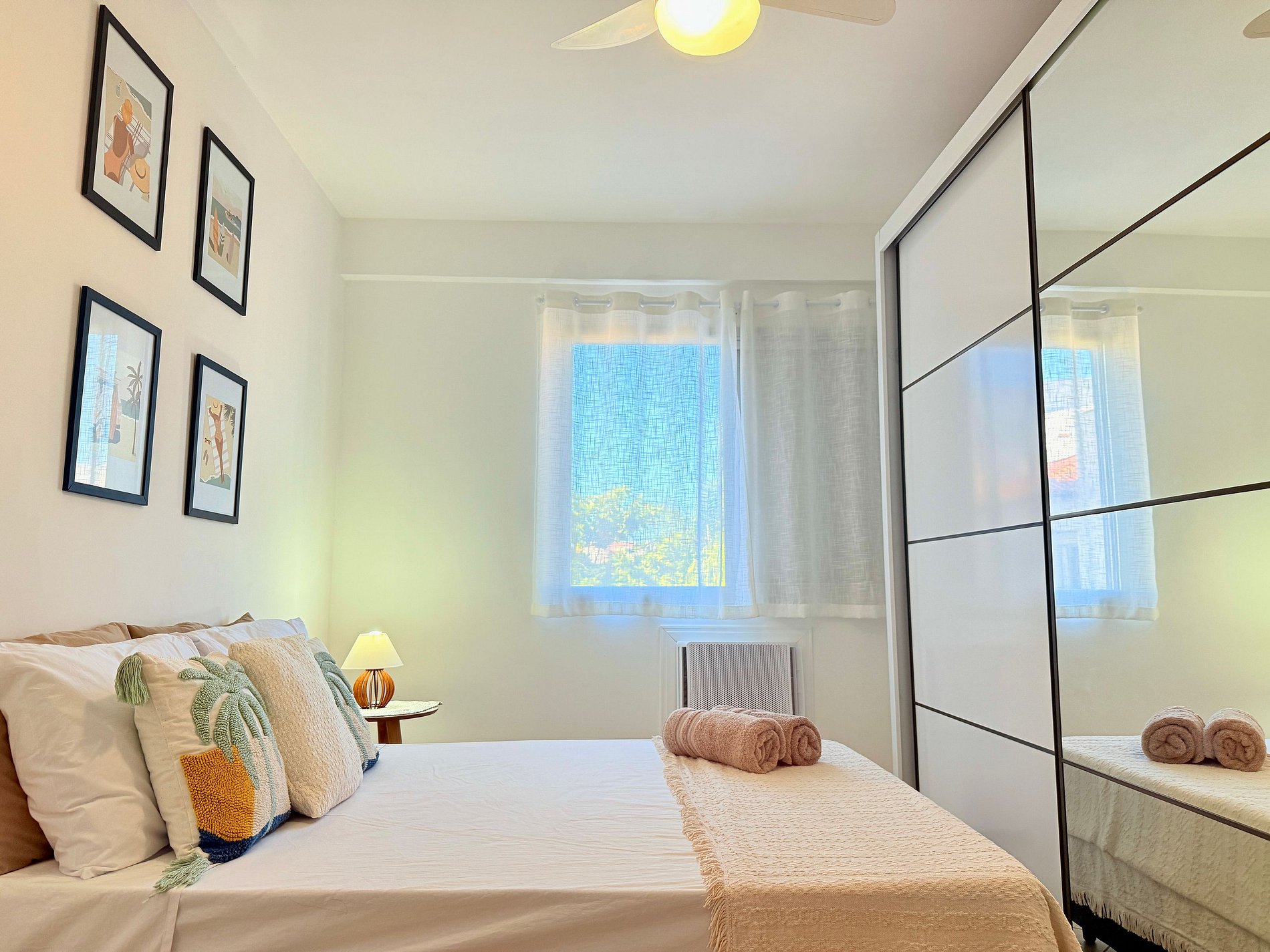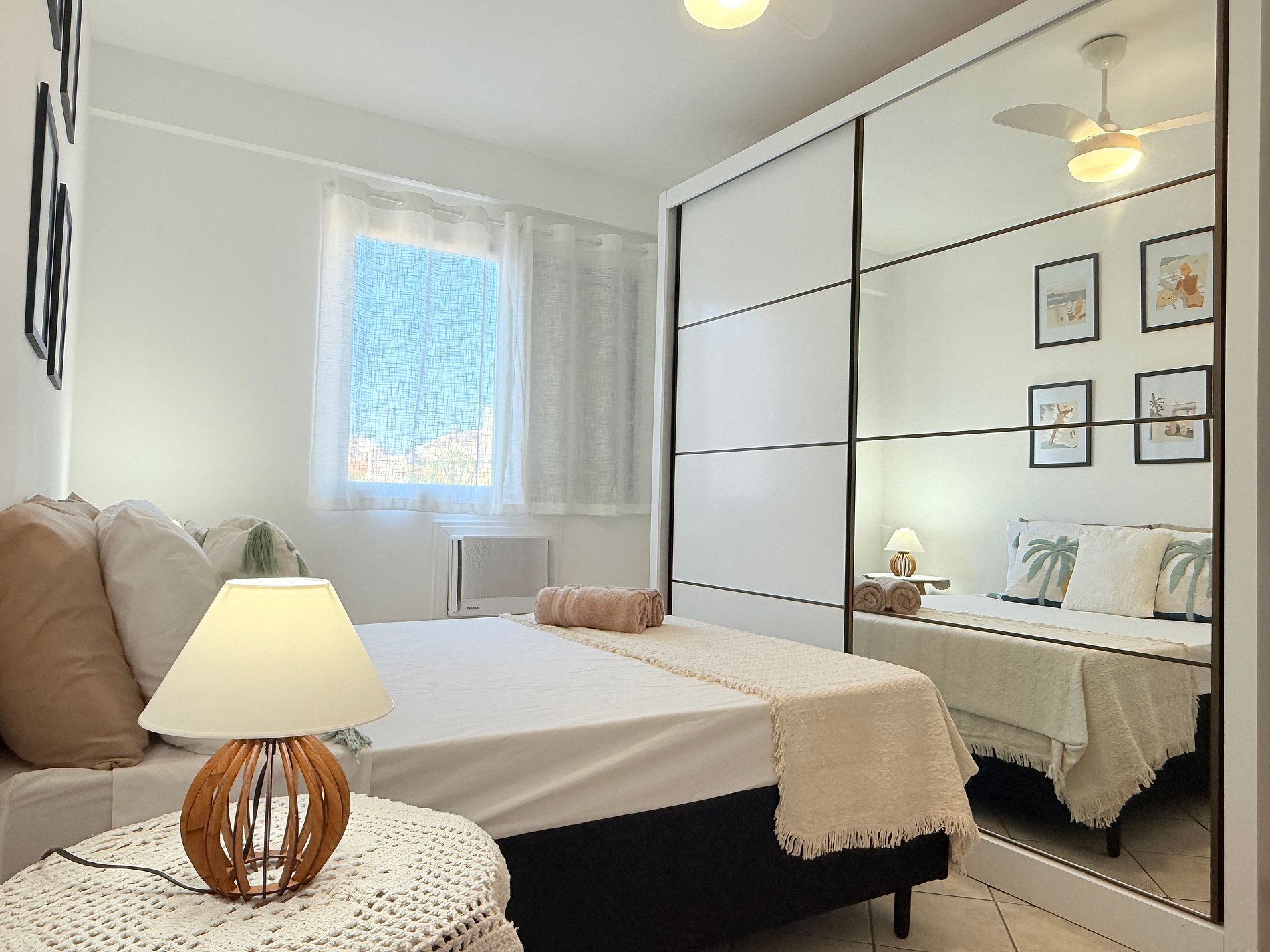 O espaço recém mobiliado oferece um quarto com cama casal, roupeiro e ar-condicionado. Segundo quarto com 4 camas solteiros (beliches), e também ar-condicionado, 1 banheiro e lavanderia.